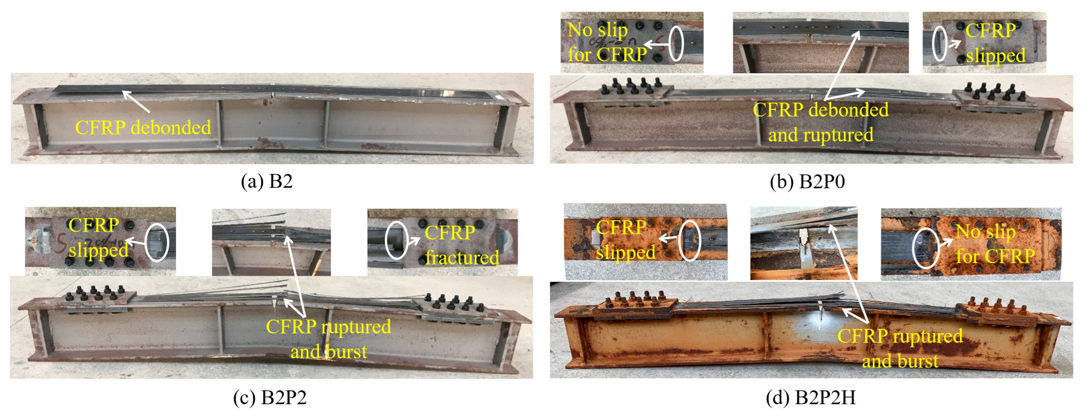 Figure 11), all specimens initiated debonding from the midspan prefabricated crack. As the load increased, instantaneous debonding occurred at the adhesive interface, causing a temporary drop in load. This behavior is primarily attributed to the relatively long bonded length of the CFRP plate; after instantaneous debonding, the interfacial cracks had not yet propagated to the plate ends, allowing the strengthened system to continue carrying load. For non-prestressed specimens with end anchors, failure was characterized by the CFRP plate being pulled out from the end anchors. In contrast, prestressed specimens, regardless of environmental exposure, exhibited a mixed failure mode combining CFRP rupture and end-anchor pullout. These results indicate that prestressed strengthening enables CFRP plates to fail in the material rather than solely by interfacial debonding, thereby significantly enhancing the utilization of the CFRP’s high-strength capacity at ultimate load.