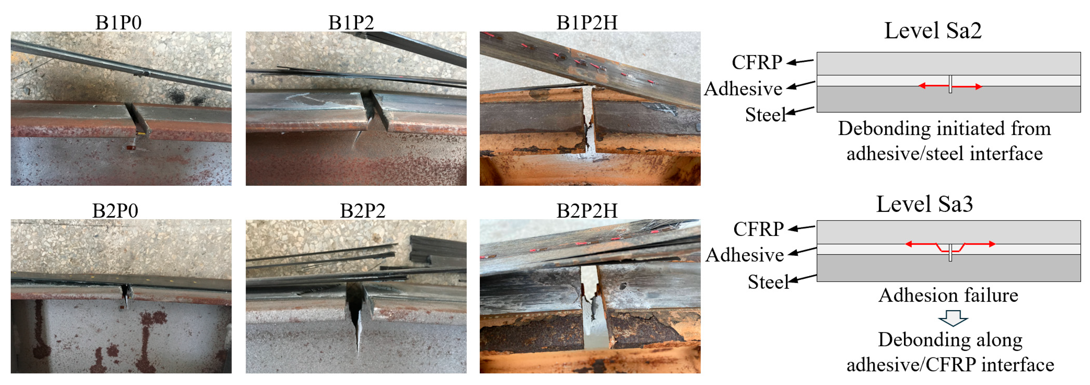 Figure 12 presents the local failure modes at the midspan crack: specimens with Sa2 treatment (B1P0, B1P2, B1P2H) primarily exhibited failure at the steel–adhesive interface, whereas specimens with Sa3 treatment (B2P0, B2P2, B2P2H) first experienced cohesive failure within the adhesive layer, followed by debonding at the CFRP–adhesive interface. From the perspective of interfacial formation mechanisms, the CFRP–adhesive interface constitutes a strong phase, whereas the steel–adhesive interface is a weak phase, making the steel/adhesive interface more susceptible to failure. Increasing the roughness of the steel bonding surface promotes the formation of an interlocking dentate structure between the adhesive and steel surface, thereby enhancing bond strength, improving interfacial cracking resistance, and altering the failure mode. After hygrothermal treatment, corrosive media penetrate more easily into the Sa2 interface compared with the higher-roughness Sa3 specimens, resulting in a more pronounced reduction in steel/adhesive bond strength and a decrease in adhesive cracking load. Comparison of the local failure in B1P2H and B2P2H shows rust formation at the bond interface in B1P2H, whereas B2P2H remained free of corrosion, indicating that a superior bonding interface helps resist the ingress of corrosive agents.