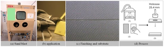 Sample preparation process: (a) sandblasting equipment, (b) sandblast application, and (c) sample cleaning with wipes. After preparing the rectangular prepreg coupons, MGS418 adhesive is applied to join both coupons, and a (d) 25.4 mm (1-inch) holesaw is used to extract the substrate.