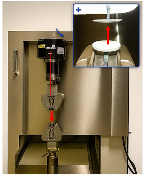 Tensile lap shear tests were conducted on a calibrated 10 kN universal testing machine following the general principles of ASTM D1002 [24] for guidance on test setup and procedure, as shown in Figure 3. A constant crosshead displacement rate of 1.3 mm/min was applied until joint failure. The peak lap shear load (in Newtons) was recorded as the primary response.