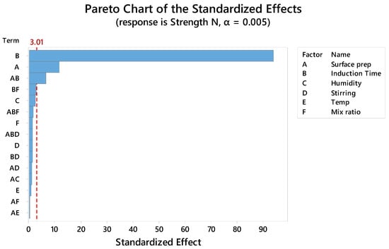 Pareto Chart of the Standardized Effects. The chart confirms for main factors that only Induction Time (B) and Surface Preparation (A) exceed the statistical significance threshold (α = 0.005, dashed line).