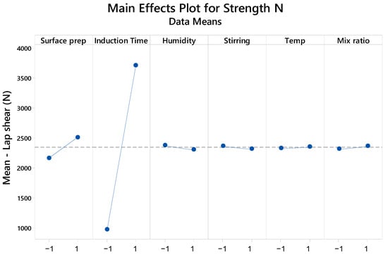 All other factors were statistically insignificant (p > 0.10). The Pareto Chart (Figure 4) clearly illustrates this hierarchy. The Main Effects Plot (Figure 5) illustrates the magnitude and direction of each factor’s influence. Moving from the low to high level of Induction Time produced the largest positive change in mean strength, while the same change for Surface Preparation produced the second-largest positive change. Conversely, increasing Humidity resulted in a negative change in mean strength.