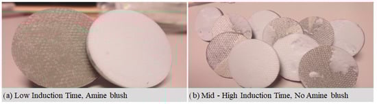 Substrates with low induction time are prone to amine blush due to premature exposure of reactive amines to ambient moisture and CO2, resulting in surface contamination, reduced cross-linking, and poor interfacial bonding, which leads to low lap shear testing results. In contrast, substrates with mid to high induction time undergo a longer pre-reaction period that minimizes the risk of amine blush by allowing the reactive components to partially cure before environmental exposure (Figure 6).