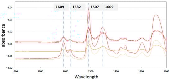 Amine Blush detected in FTIR for samples with low induction time and 90% humidity. The peak at 1582 cm−1 relative to 1609 cm−1 indicates blush. (Vertical axis: Absorbance; Horizontal axis: Wavenumber, cm−1).