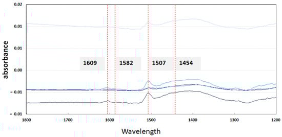 Amine Blush not detected in FTIR for samples with high induction time at 90% humidity. The 1582 cm−1 peak is absent. (Vertical axis: Absorbance; Horizontal axis: Wavenumber, cm−1).