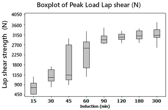 Figure 10. Boxplot of Peak Load (lbf) vs. Induction Time (min). The plot shows strength improving and variability (box size) decreasing as induction time increases, plateauing in the 85–120 min range. - Secondary Control: Surface Preparation Mechanical abrasion is essential to activate the substrate and enable mechanical interlocking, providing a significant and consistent strength benefit.