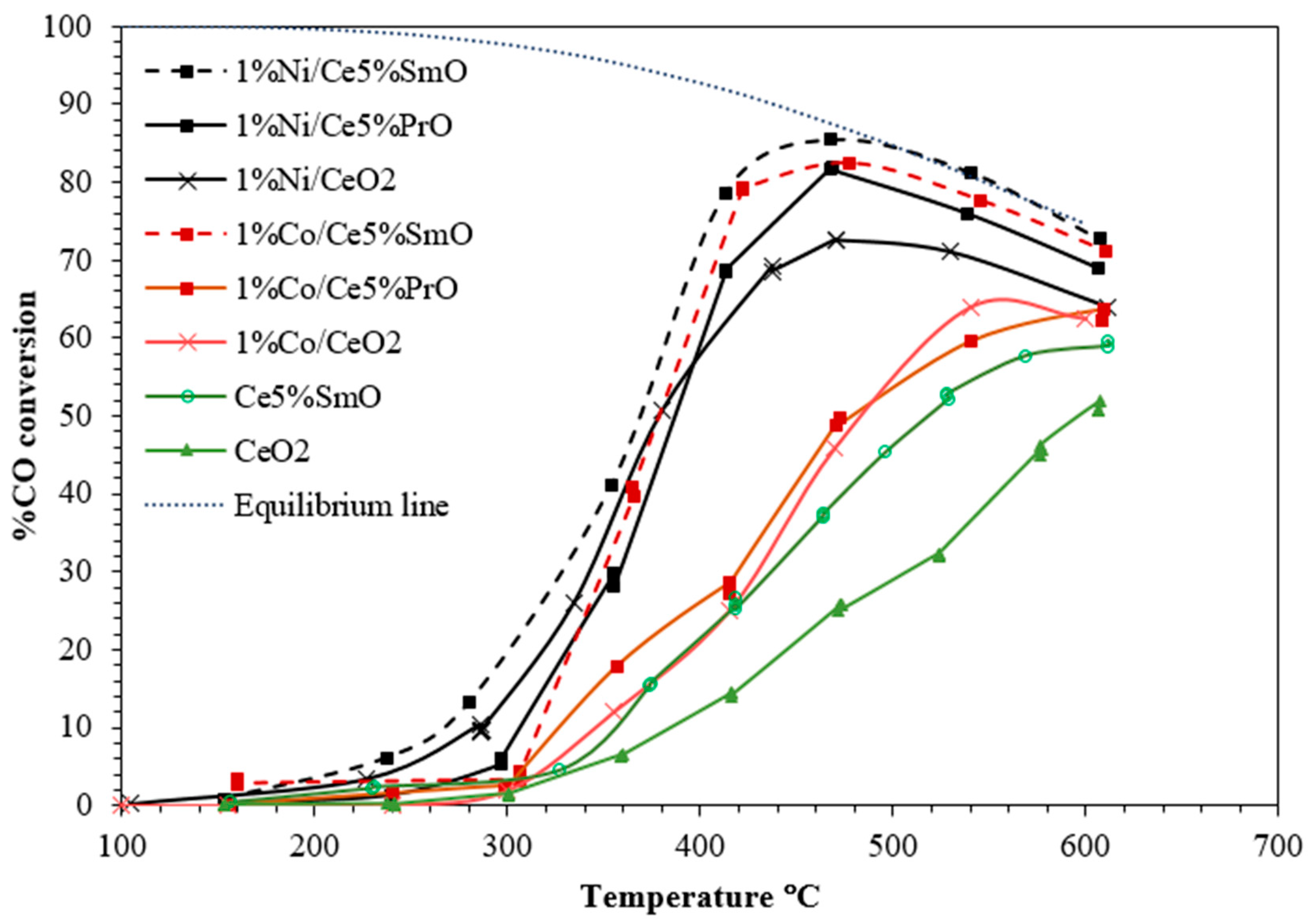2 is not an active catalyst for WGS reaction. Its activity is significantly enhanced when modified with Ni and Co, or when doped with Sm. The CO conversion of all catalysts increases with increasing reaction temperature. 1%Ni/Ce5%SmO is a superior WGS catalyst compared to other catalysts. Notably, almost 90% CO conversion can be achieved at 450 °C over 1%Ni/Ce5%SmO catalyst, and the conversion slightly decreases at temperatures higher than 450 °C. In the case of Co-containing ceria catalysts, the CO conversion of Co on Ce5%SmO support is much higher than that of Co on CeO