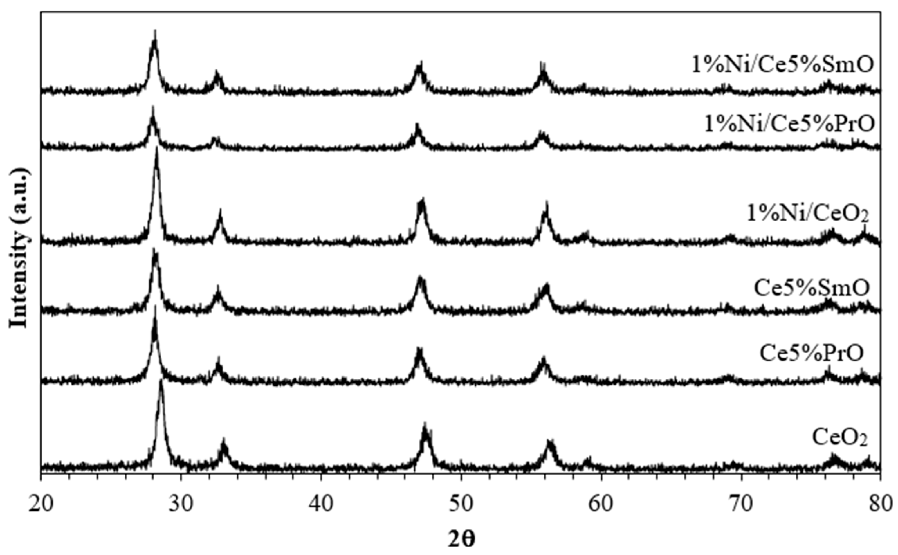 2 crystallite size together with high surface area, indicating a greater distribution of the catalysts. The absence of Sm and Pr in the preparation of CeO