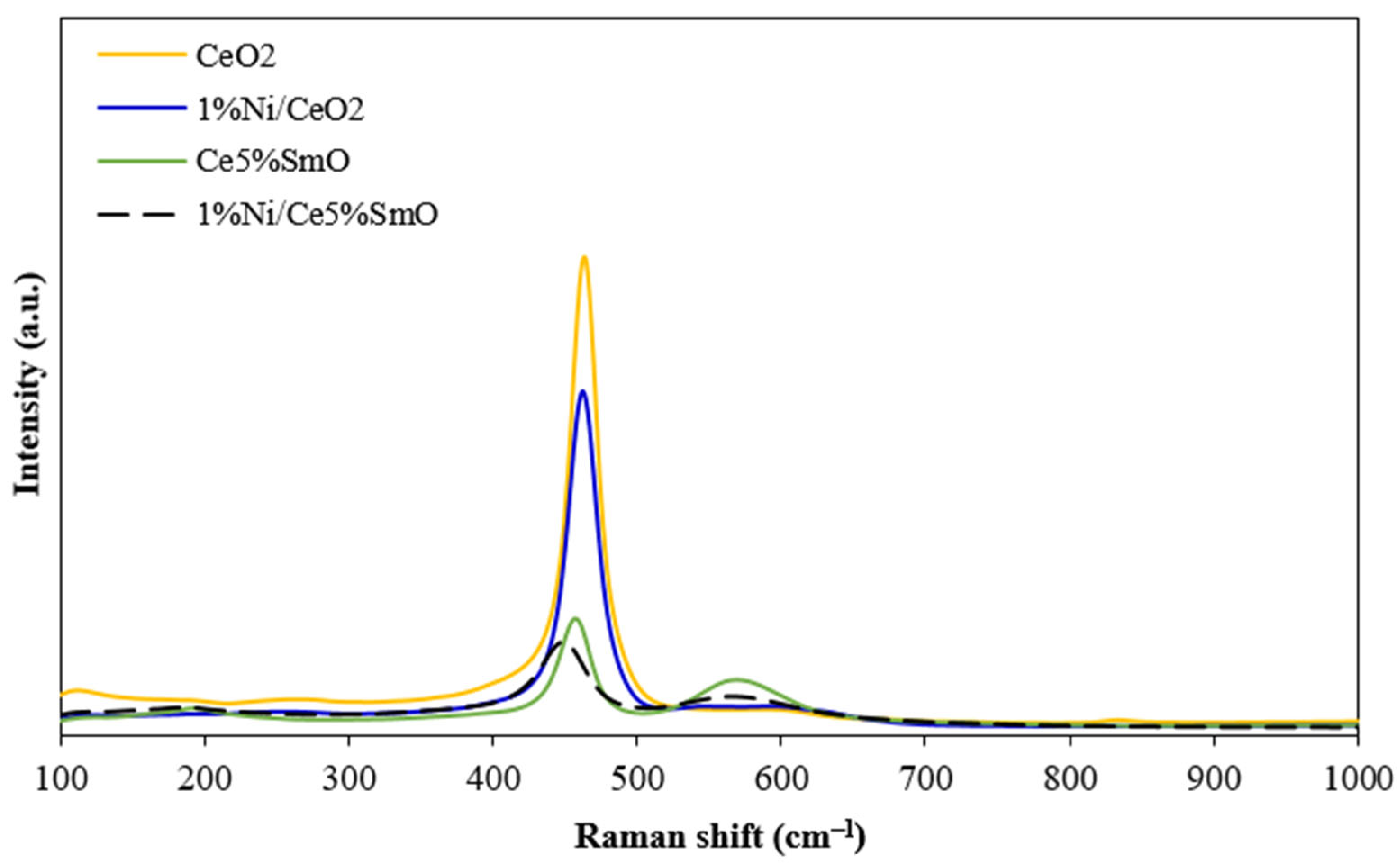 2 and Ni/Ce5%SmO, the D peak intensity of the 1%Ni/Ce5%SmO catalyst was higher than that of 1%Ni/CeO