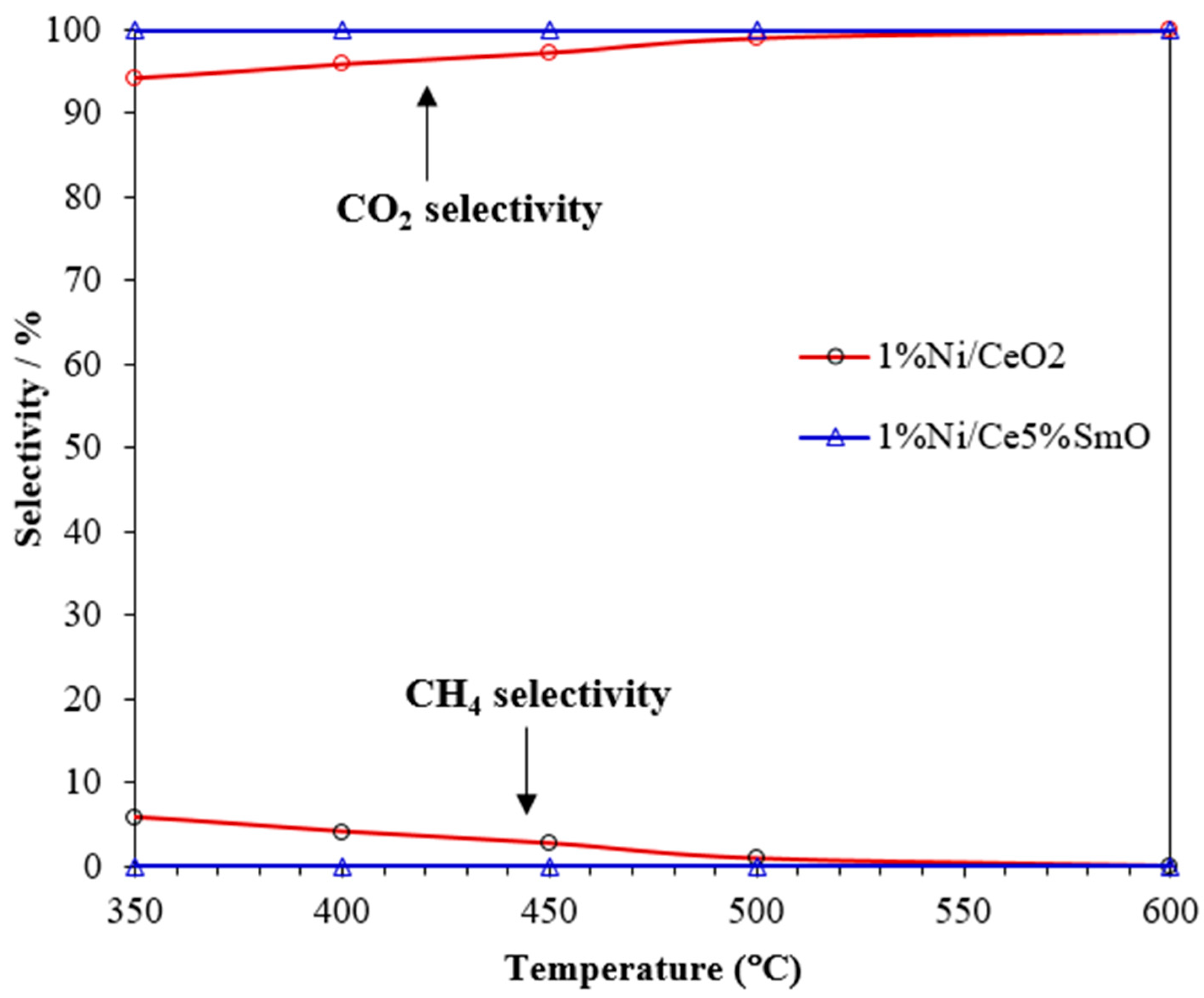 4 selectivity at all temperatures studied. This is due to the high oxygen vacancy amount of the Ni/Ce5%SmO catalyst, which disrupts the methanation reaction by increasing the supply of oxygen atoms. The 1%Ni/Ce5%SmO catalyst clearly exhibited higher activity than the Ni/CeO