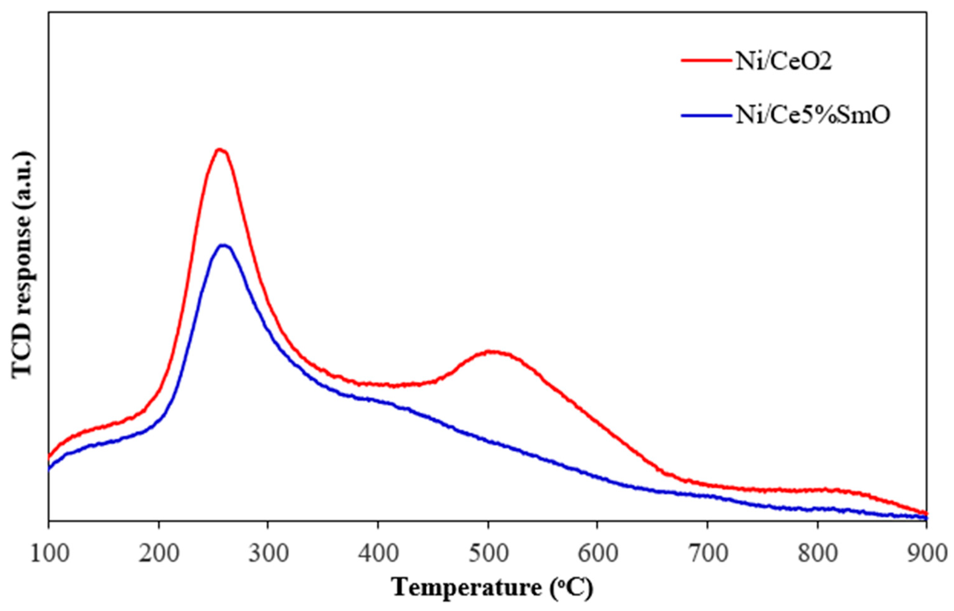 2 (1.93 mmol/g) < 1%Ni/Ce5%SmO (2.15 mmol/g) < 1%Ni/Ce5%PrO (2.19 mmol/g). Accordingly, the reduction temperature and H