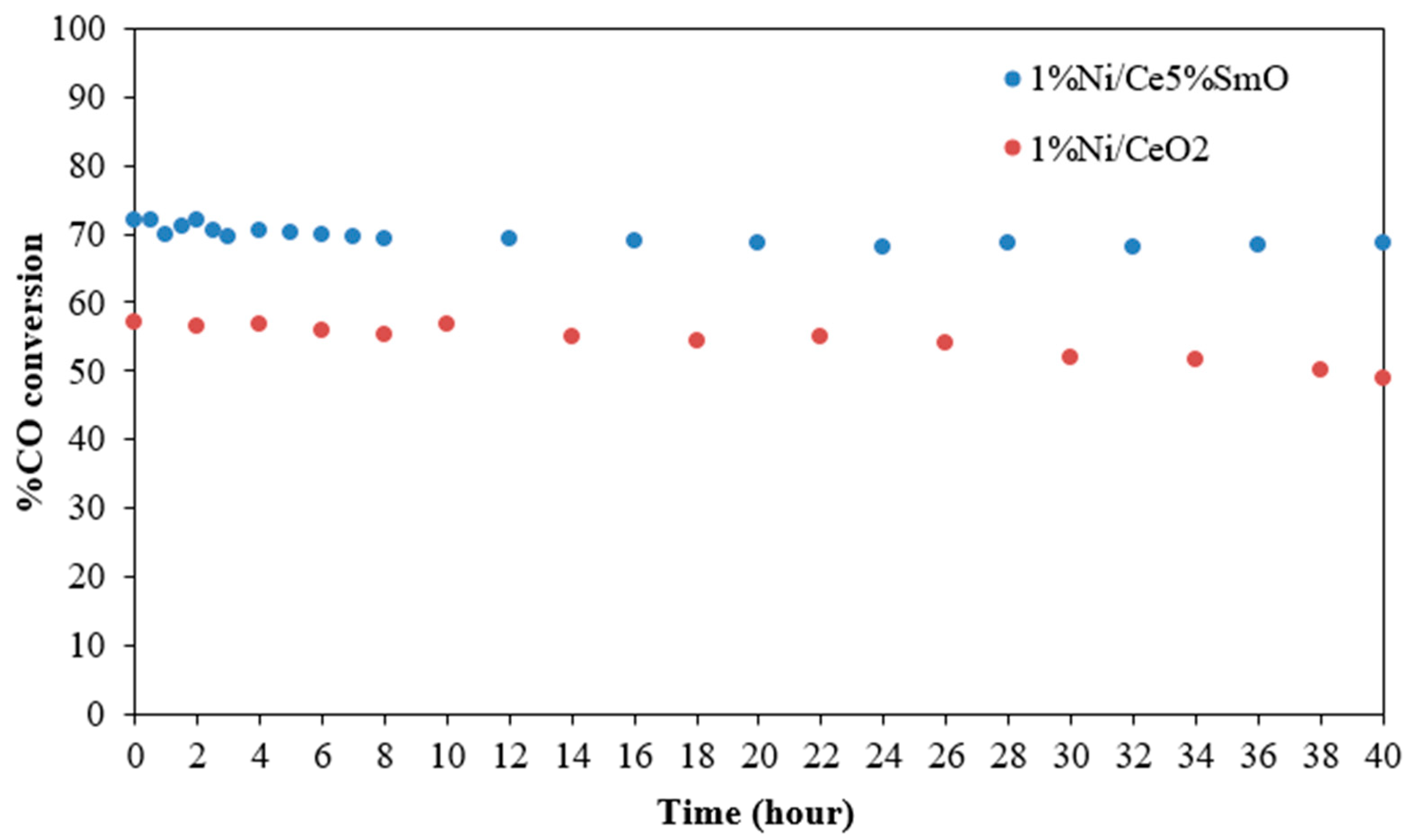 Figure 9. The Ni/Ce5%SmO catalyst maintained consistent CO conversion in the whole period of 40 h, demonstrating its good stability. Notably, the Ni/CeO