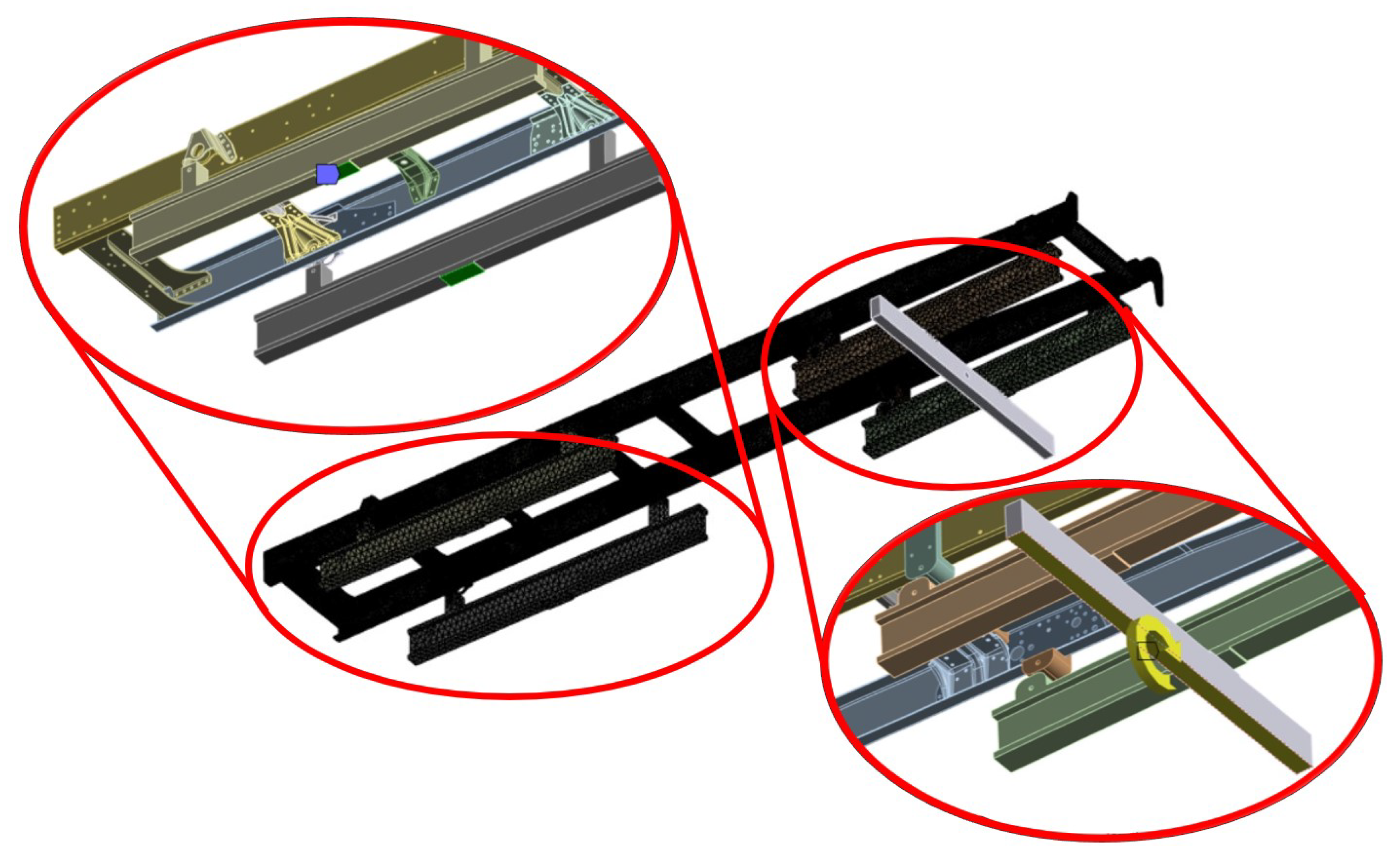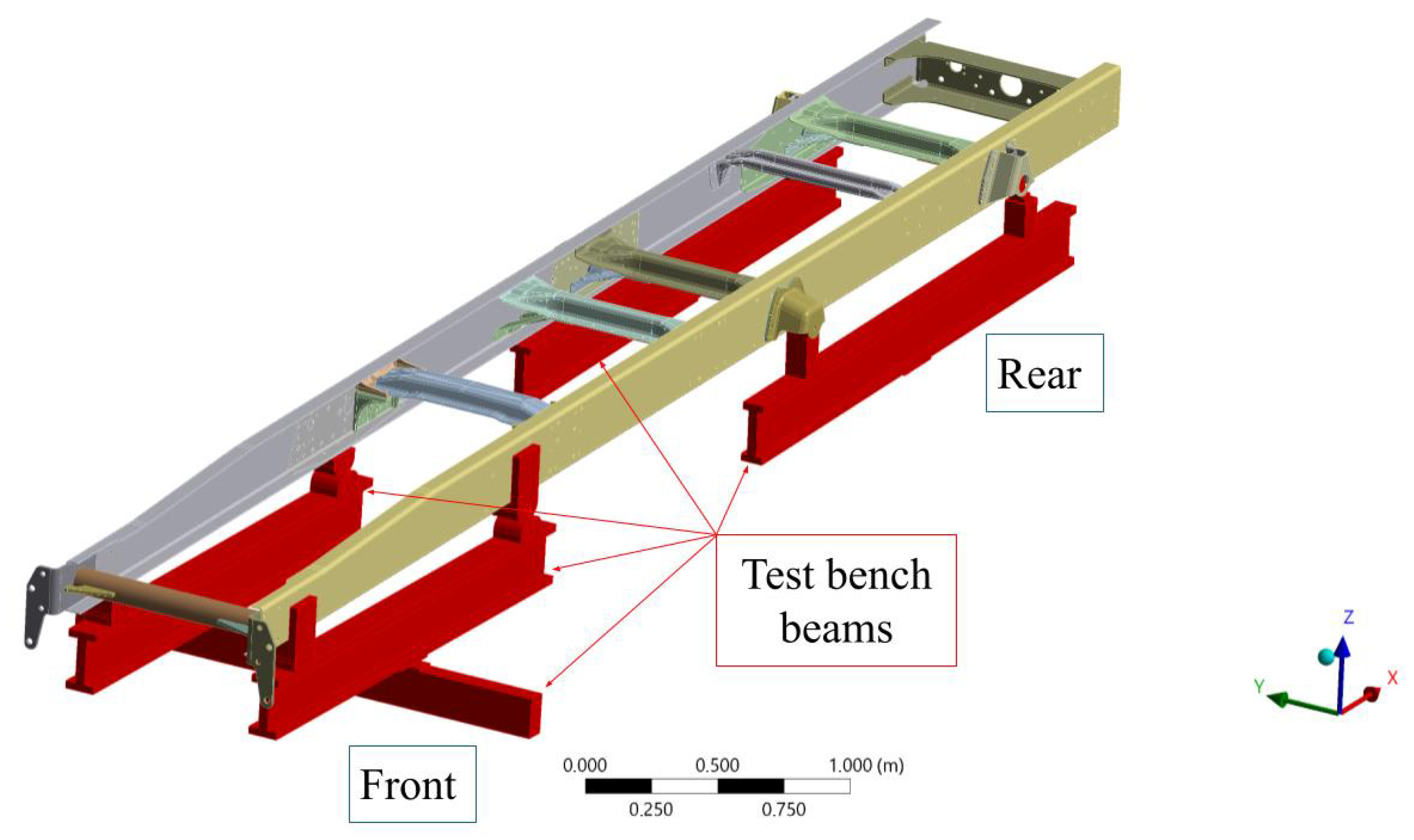 - Front Support: the front side of the chassis frame was constrained to the test bench at the front suspension mounting points as shown in Figure 5. This configuration permitted the frame the rotation, enabling load application at this side. The front suspension was replaced by a rigid element that can tilt.Figure 5. Front constraints of the HCV chassis frame.