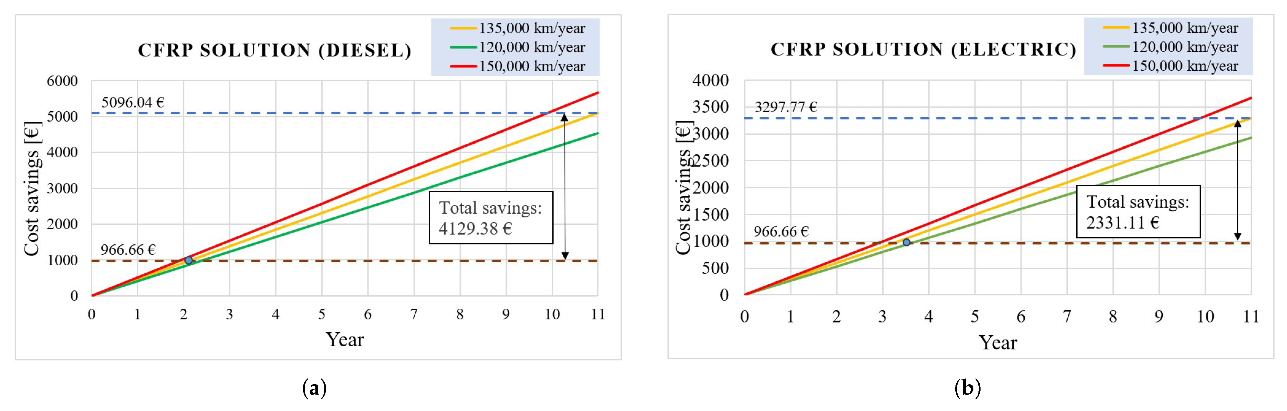 - Environmental impact: For both diesel and electric HCVs, the CFRP solution led to important reductions in CO2 emissions and operating expenses.