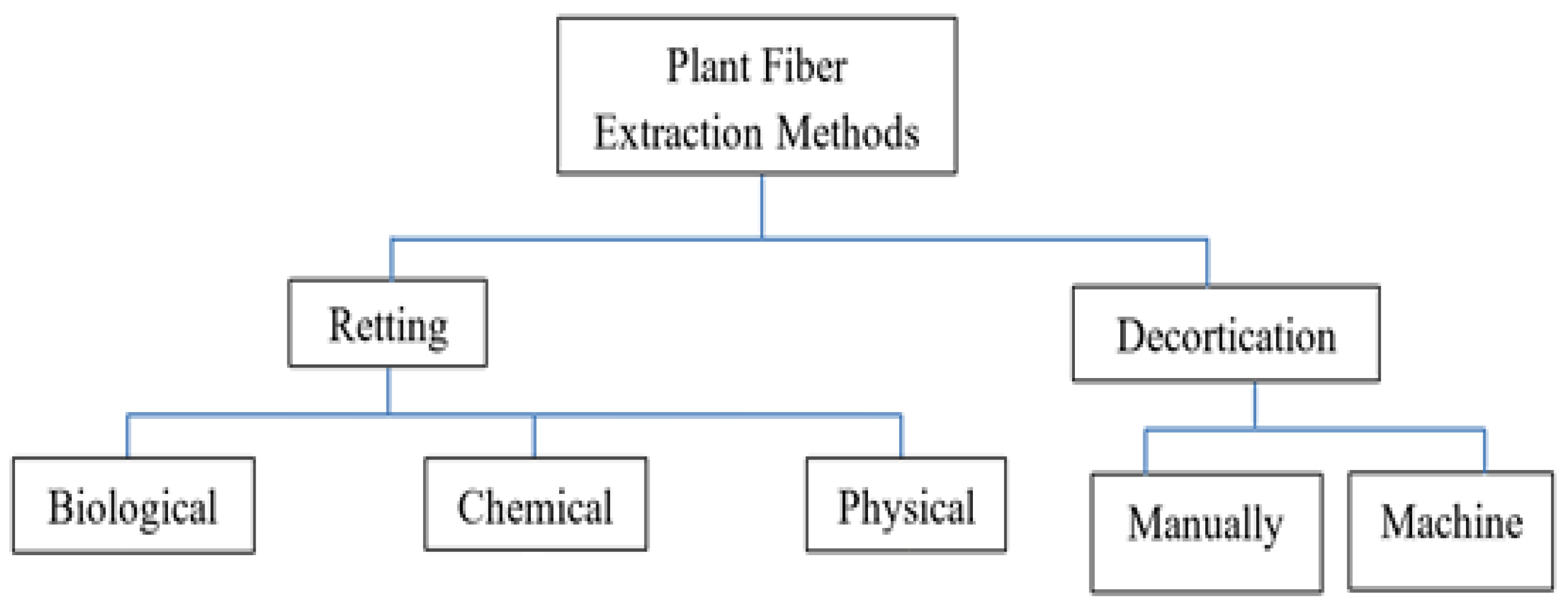 The features of natural fibers depend on the preparation and processing of the fibers. One of the primary elements influencing the mechanical characteristics of natural fibers and their composites is the fiber extraction technique used. Decortication and retting techniques are the most widely used to extract fiber from plants [2]. Different types of plant fiber extraction methods are shown in Figure 1. The effects of different extraction methods on the mechanical properties of kenaf fiber have been investigated, and the results show that higher tensile strengths were achieved with water retting, decortication, and NaOH retting [4]. The results of physical and bio-extraction are nearly identical, except for a slight variation in the ideal period for bio-extraction [5]. Water retting is the extraction process in which the harvested parts of the plant are submerged in flowing or sluggish water for about 14 to 21 days. This method takes a long time and can cause significant water pollution [6,7].
