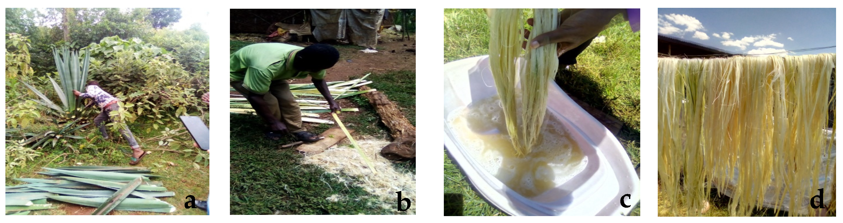 The steps of fiber extraction are demonstrated in Figure 2, Figure 3 and Figure 4, in which manual extraction is shown in Figure 2a–d, machine extraction is shown in Figure 3a–d, and treatment is shown in Figure 4a–c. After extraction, fresh water is used to wash and dry fibers outdoors. The sisal fibers were treated with 5% NaOH for 2 h. The fibers were then repeatedly cleaned with fresh water, rinsed with distilled water to remove any remaining NaOH, and allowed to dry for 24 h at room temperature.