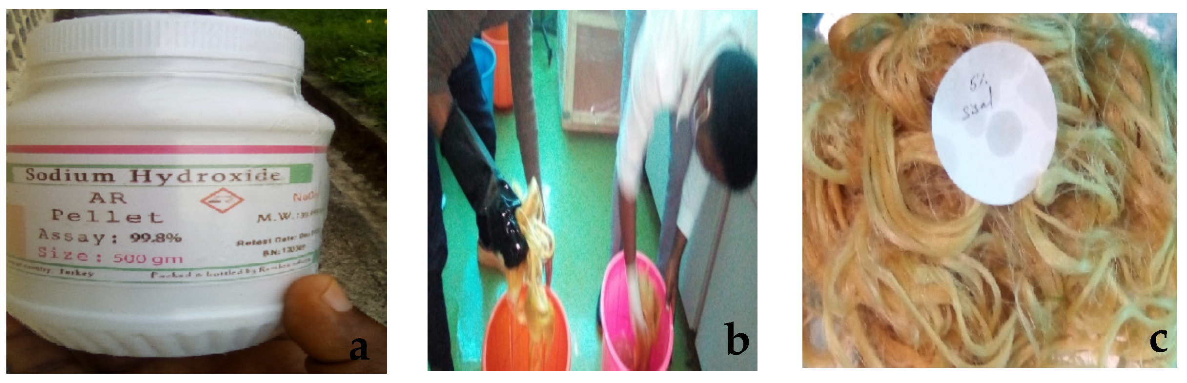 Figure 4. Fiber treatment with alkali: (a) NaOH, (b) fiber washed with distilled water, (c) sample of treated fiber.
