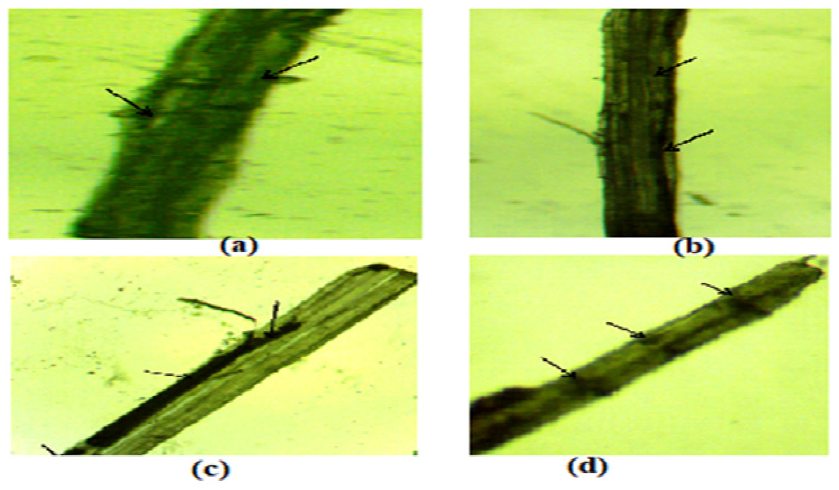 Figure 6. Optical microscopy images of sisal fibers: (a) untreated machine-extracted fibers, (b) untreated manually extracted fibers, (c) treated machine-extracted fibers, (d) treated manually extracted fibers.