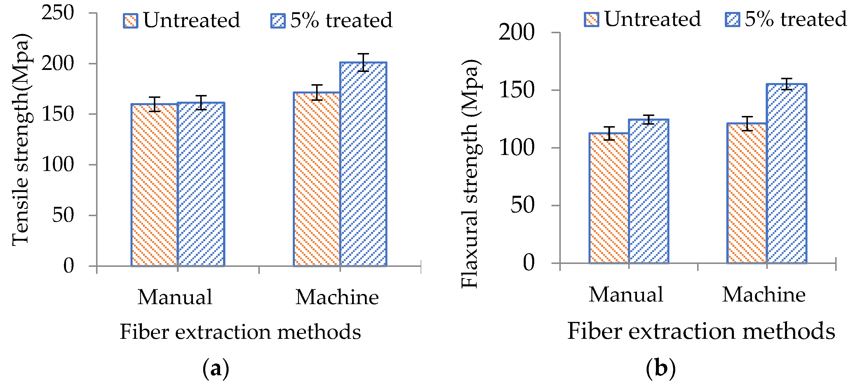 As shown in Figure 7a, the machine-extracted fiber composites have a greater tensile strength than the manually extracted fiber composites. A similar result was observed for the machine-extracted treated fiber composite and the manually extracted treated fiber composite. Machine-extracted fiber composites had a greater tensile strength, as the fibers have fewer impurities and a rough surface. Similarly, the NaOH treatment improves the tensile strength of the composite of both manually and machine-extracted fibers. The fiber that was extracted by machine and chemically treated was the best among all the types of composites. The tensile strength of the machine-extracted untreated fiber was improved by 6.7% and that of the treated fiber was improved by 19.82% compared to those of the untreated and treated manually extracted fiber composites.