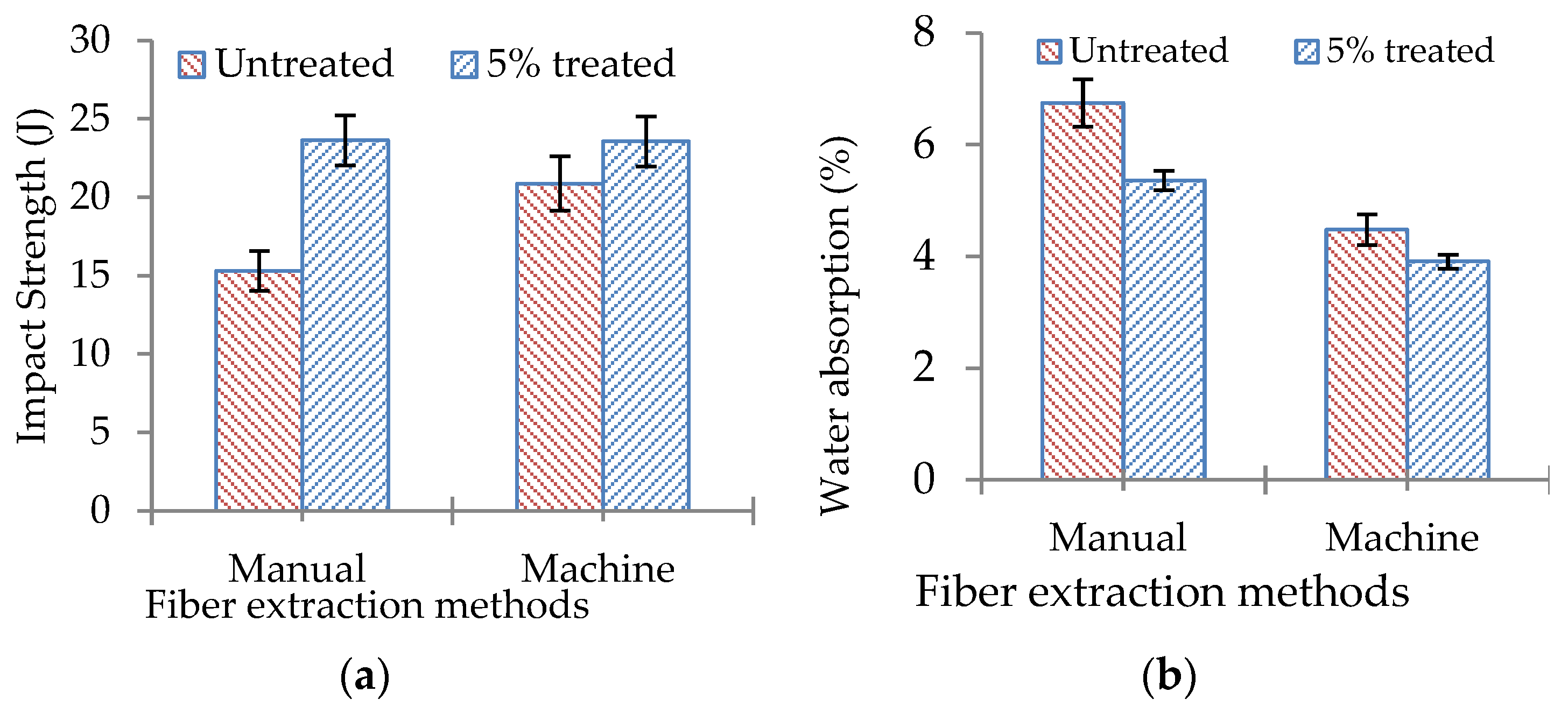 The amount of energy that a composite material dissipates before ultimately failing is measured by its impact resistance. Matrix fracture, fiber/matrix deboning, and fiber fracture in composite materials are the reasons behind impact failure. When the stress surpasses the fiber strength, a fracture happens. The broken fibers can be extracted from the matrix, causing energy loss. The effect of extraction and treatment on the sisal composite is depicted in Figure 8a. The impact strength of the machine-extracted untreated fiber was improved by 26.59% compared to the untreated manually extracted fiber composite. The treated impact results of the machine-extracted and manually extracted fibers are nearly identical.