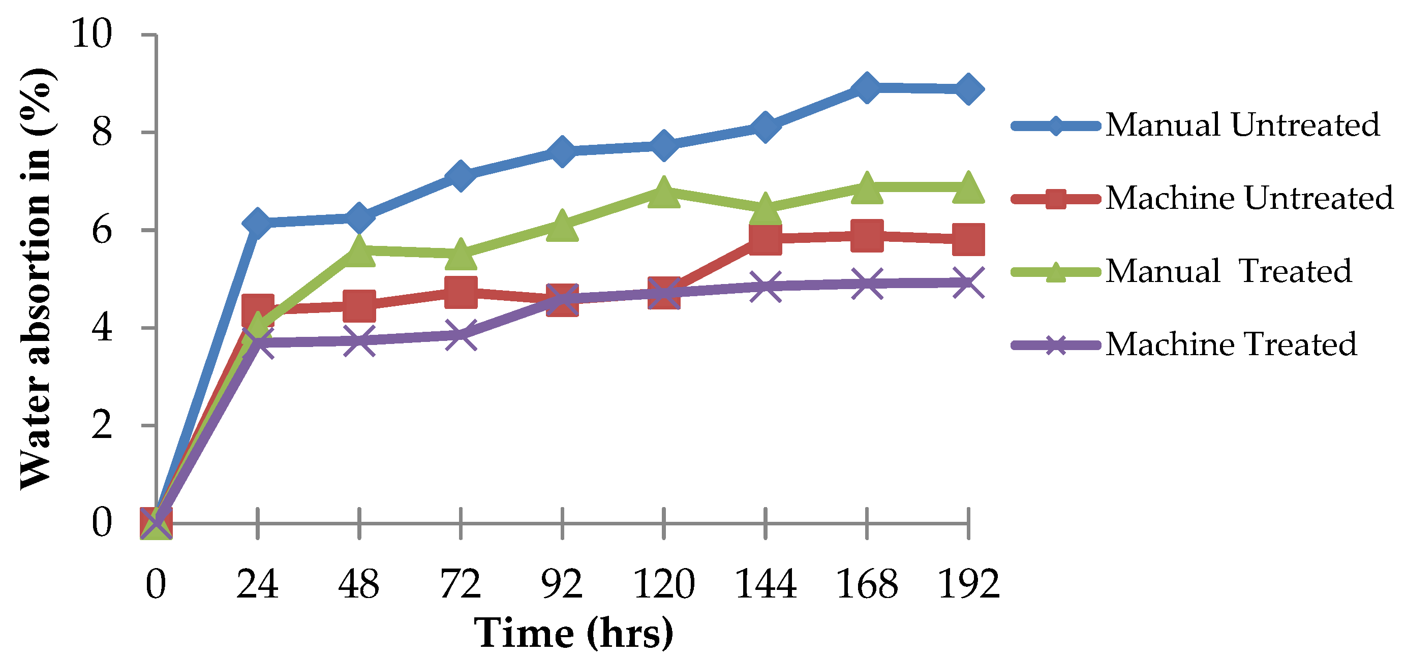 • The manually extracted, untreated composites exhibited greater water absorption compared to the machine-extracted, treated composites, demonstrating the effectiveness of the treatment and extraction method in reducing moisture uptake;