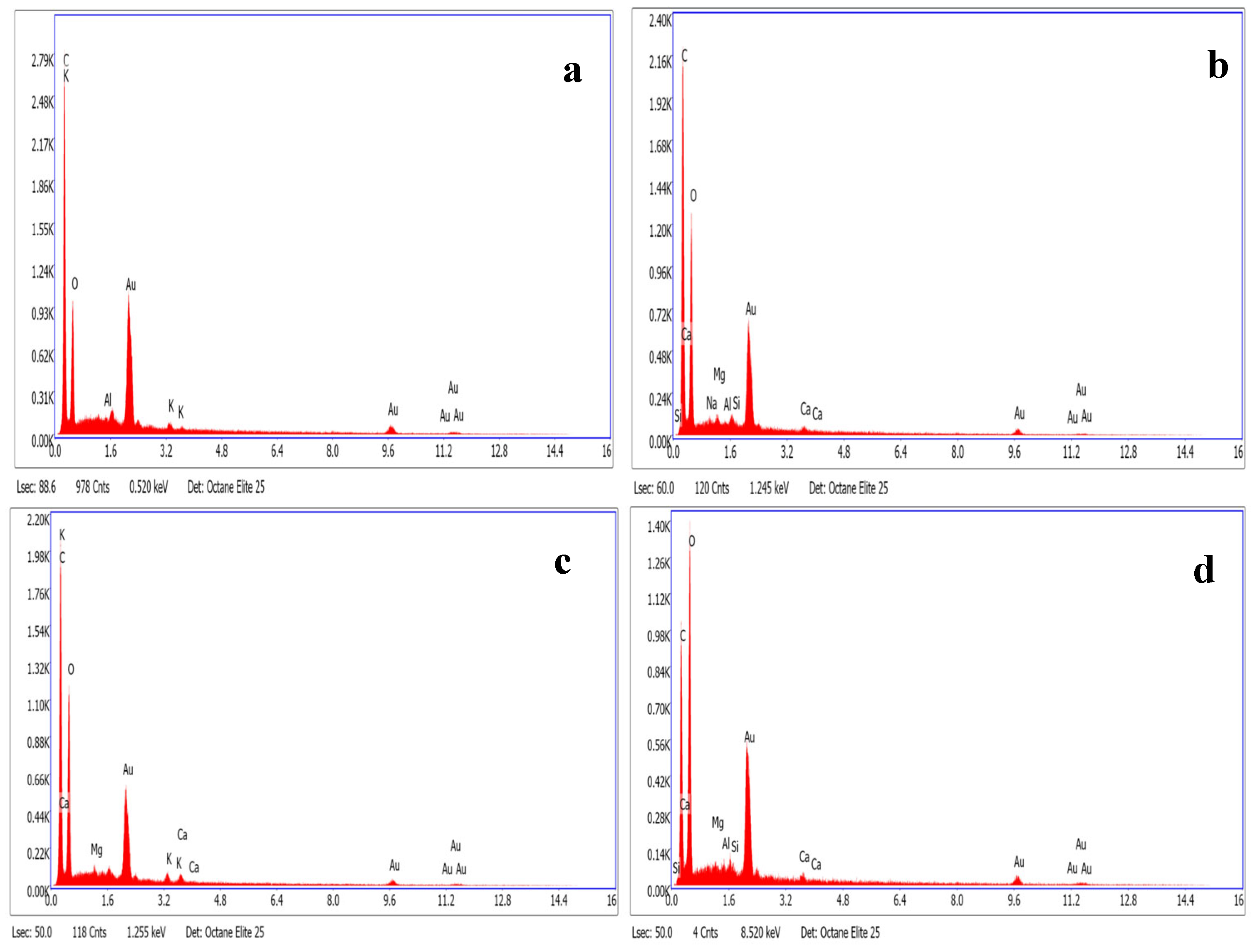 Figure 10. EDS spectrum of manually extracted (a) untreated and (b) treated fibers; and machine-extracted (c) untreated and (d) treated fibers.