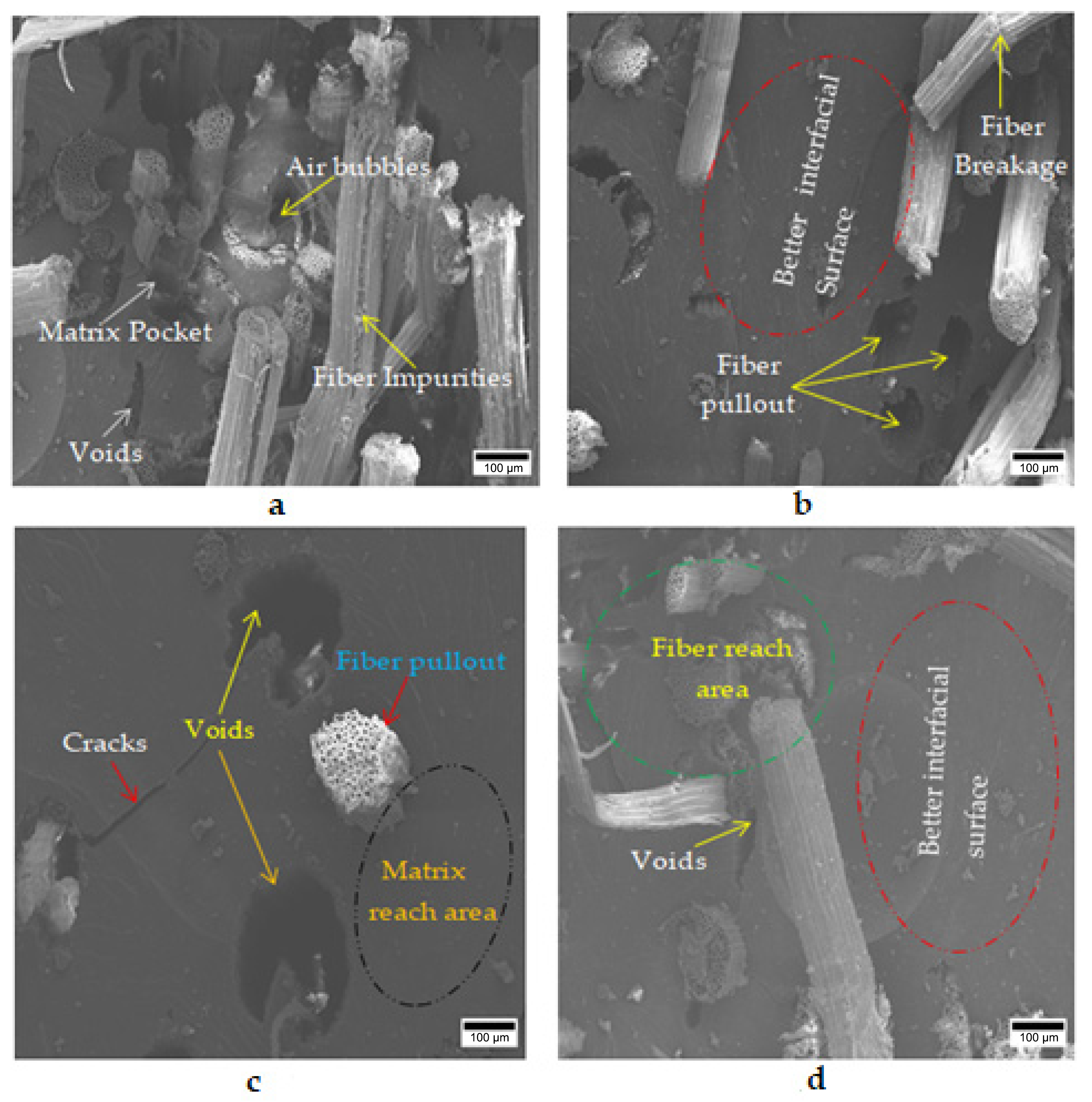 When comparing machine-extracted fiber types to manually extracted fiber composites, a satisfactory fiber matrix was found. Figure 11b shows that the alkali-treated fiber composite has a good fiber matrix interfacial surface from the manually extracted fibers. This is because alkali helps to increase the surface roughness of natural fibers by eliminating the amorphous particles. As seen in Figure 11d, the treated fiber composite also exhibits a superior fiber matrix interfacial bond in the treated machine extraction composites.