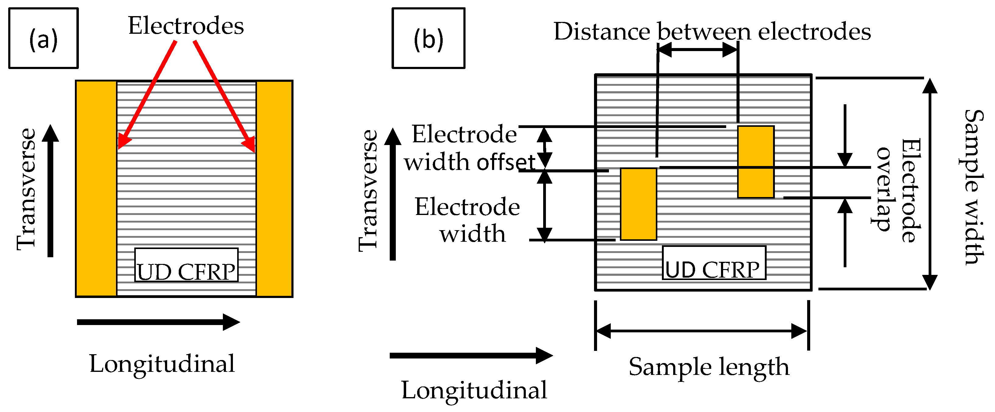 | Type of Sample | CFRP/Electrode Configuration | CFRP Length (mm) | CFRP Width (mm) | Electrode Width (mm) | Electrode Length (mm) |