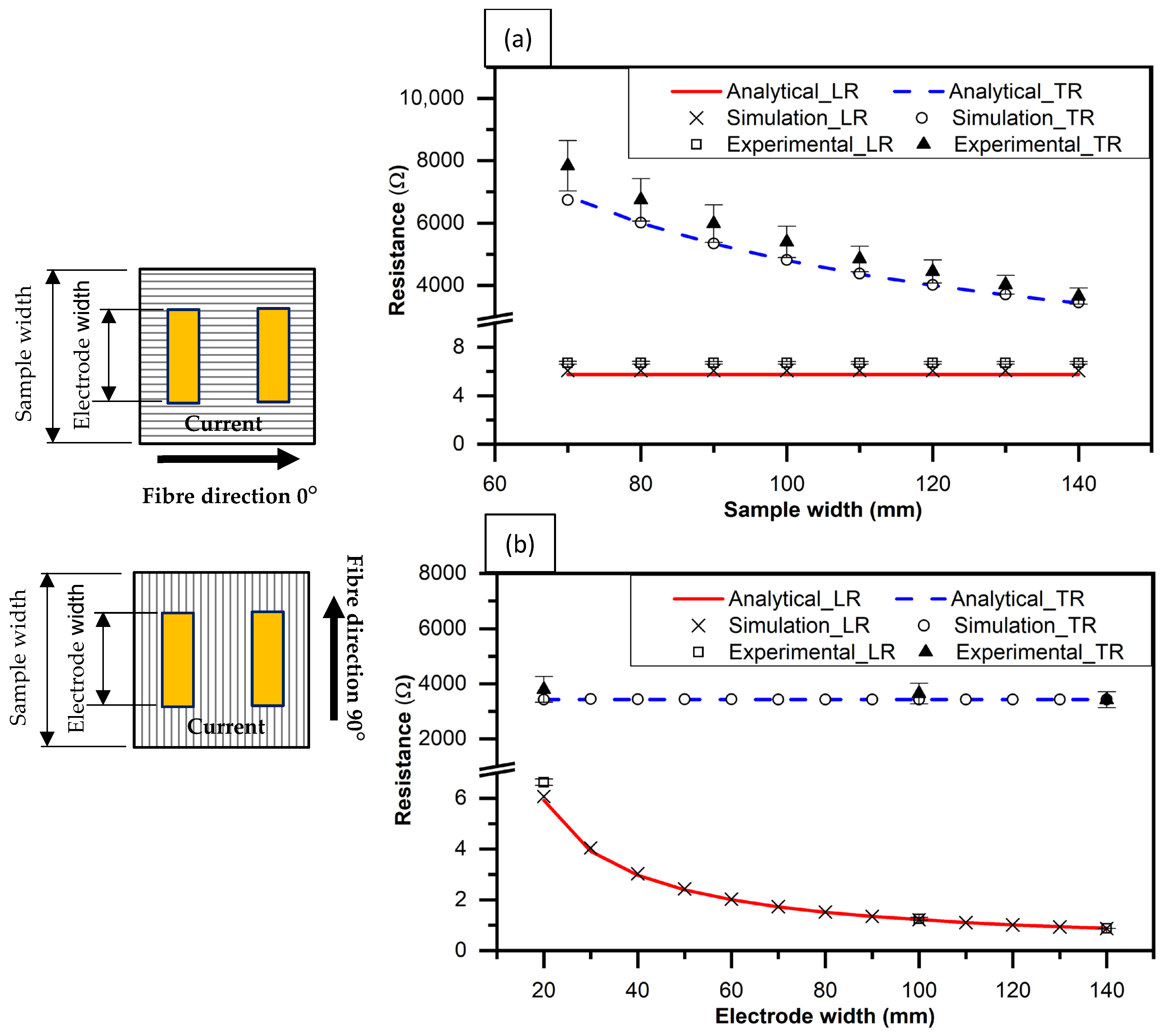 - Transverse conductive path: equals the full specimen width (), since current spreads through inter-fibre contacts across the entire laminate.