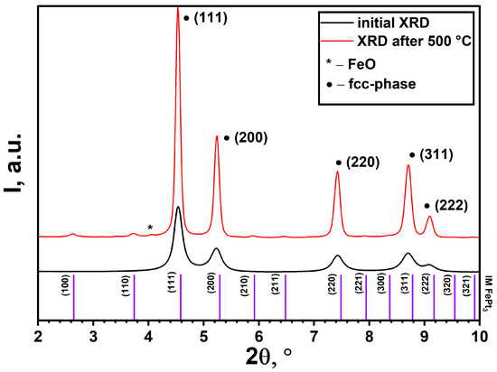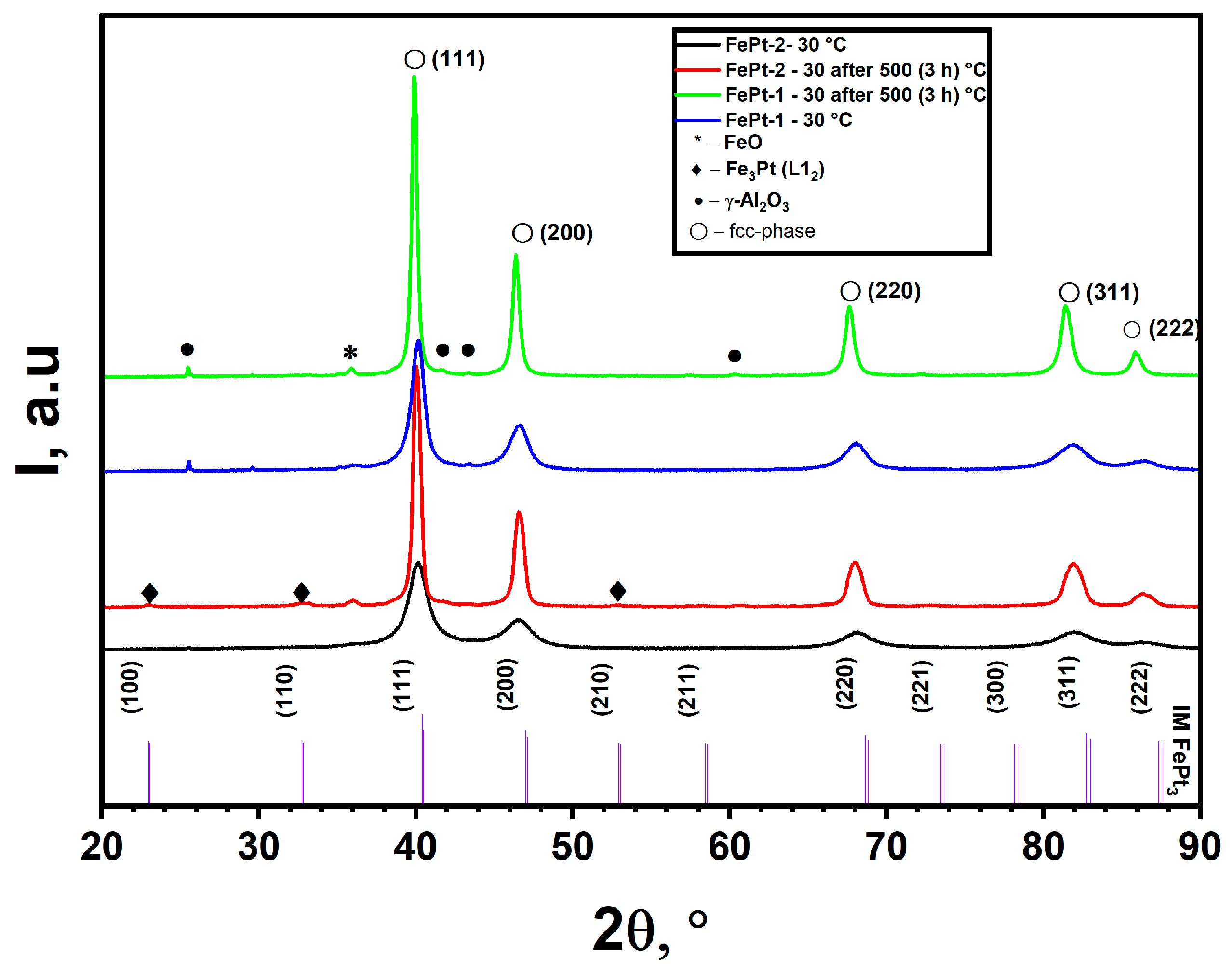 - Pugachev, V.M.; Zakharov, Y.A.; Popova, A.N.; Russakov, D.M.; Zakharov, N.S. Phase Transformations of the Nanostructured Iron-Platinum System upon Heating. J. Phys. Conf. Ser. 2021, 1749, 012036. [Google Scholar] [CrossRef]