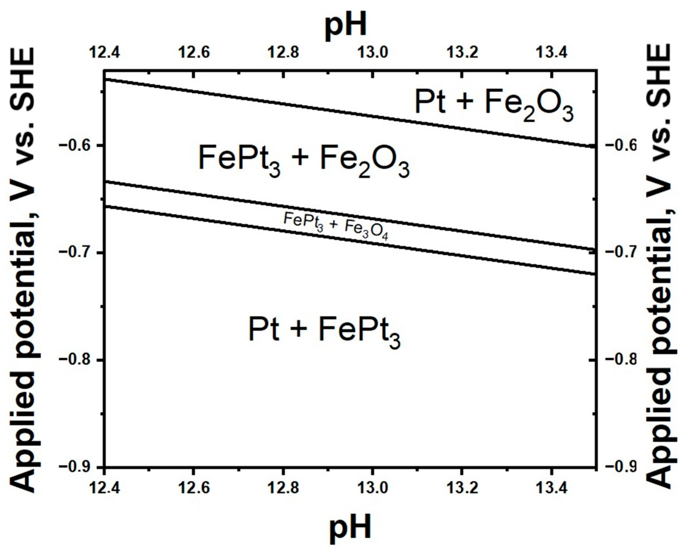 - an Fe-Pt FCC solid solution with a smaller lattice parameter of 3.903 ± 0.001 Å, corresponding to an iron content of 9.8 at.% and larger crystallites of ~10 nm.
