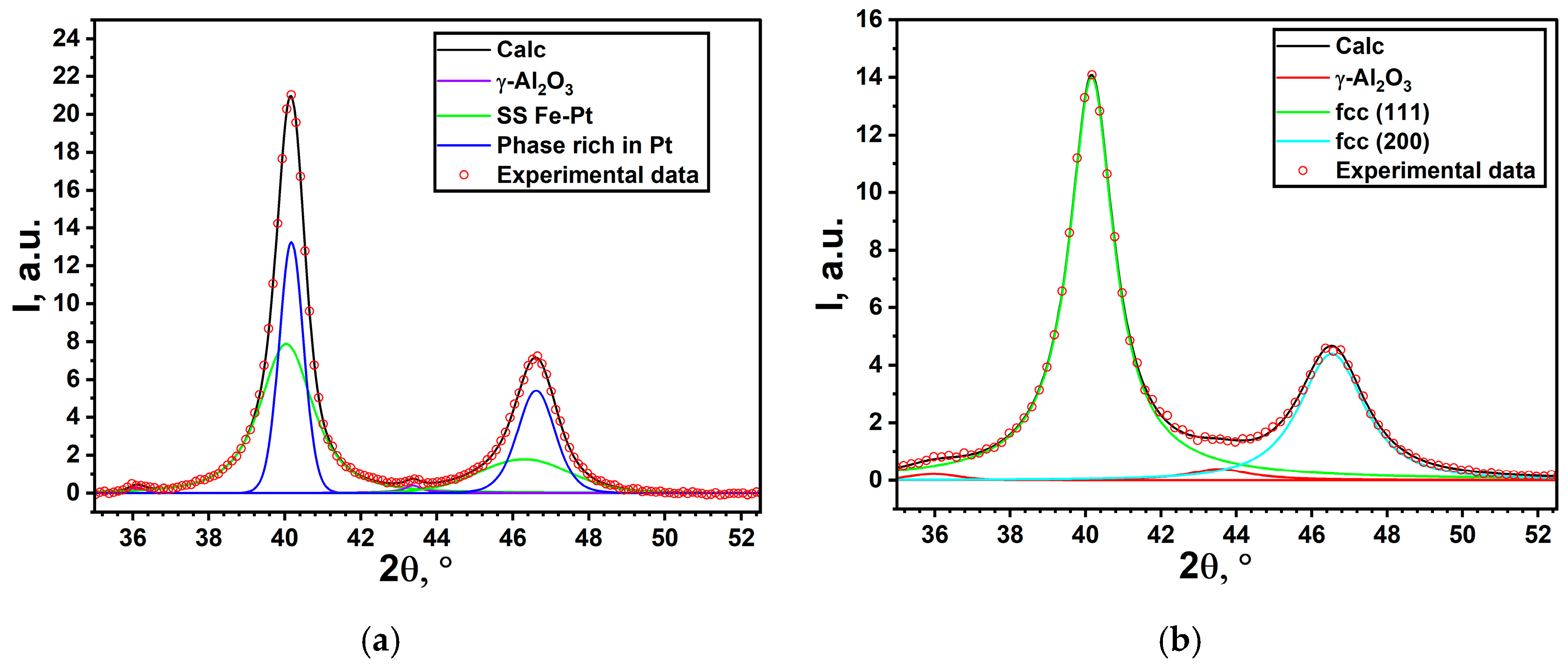- Zakharov, N.S.; Tikchonova, I.N.; Zakharov, Y.A.; Popova, A.N.; Pugachev, V.M.; Russakov, D.M. Study of the Pt-Rich Nanostructured FePt and CoPt Alloys: Oddities of Phase Composition. Lett. Mater. 2022, 12, 480–485. [Google Scholar] [CrossRef]