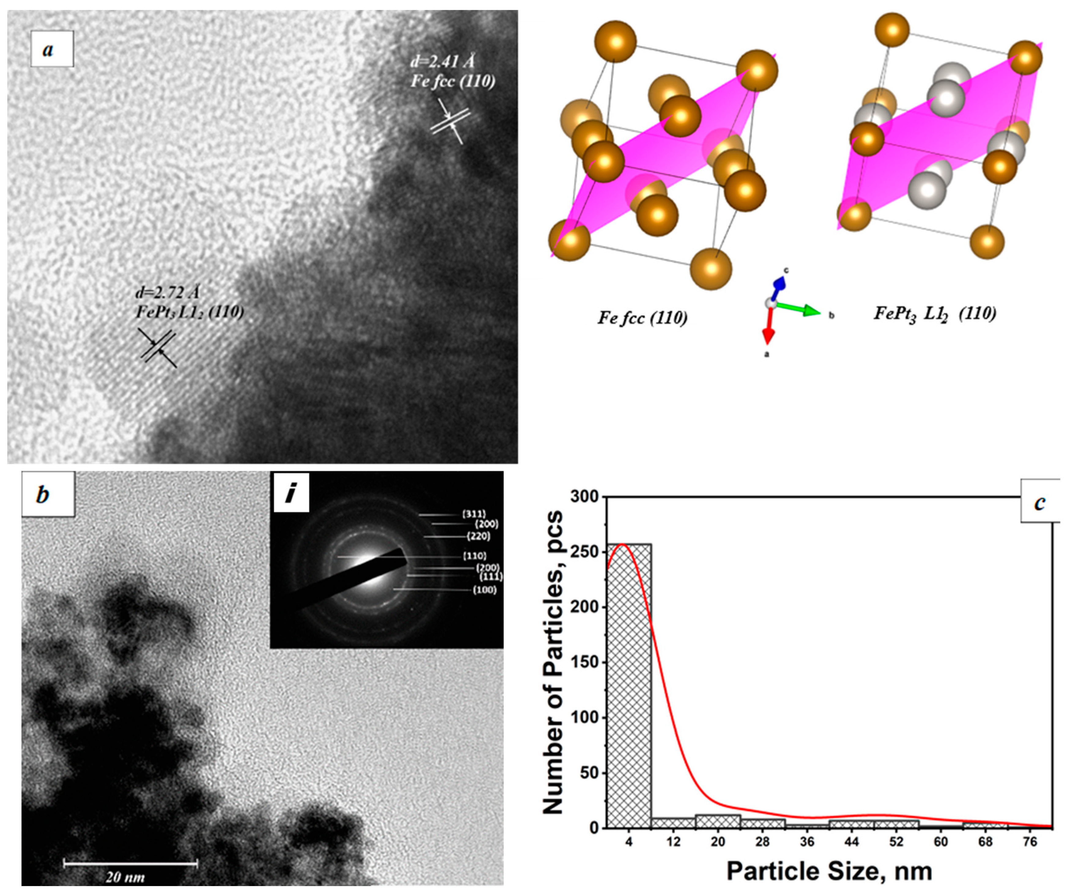 - FePt3 intermetallic domains: these iron particles are often adjacent to larger (8–10 nm) particles exhibiting lattice spacings of 2.72 Å, which correspond to the (110) planes of the L12-ordered FePt3 intermetallic phase (PDF № 01-071-8366) [25];
