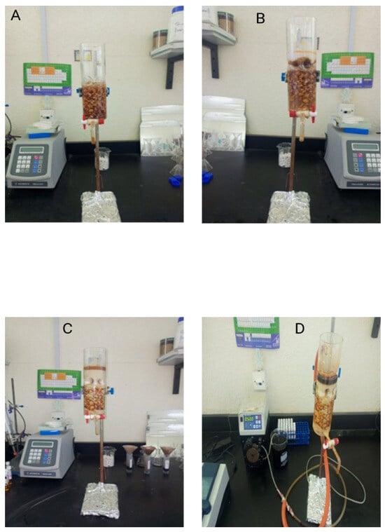 The setup of the column experiments. Where (A) C1: 350 g of coarse limestone (2–4 mm), 2 L of pretreated OMW. (B) C3: 380 g of limestone with mixed particle sizes and 4 L of pretreated OMW. (C) C4: 380 g of mixed-size limestone combined with 12 g of lime; 2 L of untreated OMW. (D) Column coupled to a pump with flow rate of (0.5 mL/min).