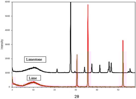 The X-ray diffraction (XRD) patterns of representative limestone samples display distinct peaks characteristic of calcite, shown in black in Figure 3. These reflections at 3.85–3.86 Å (102), 3.03 Å (100), 2.84 Å (006), 2.49 Å (110), 2.28 Å (113), 2.09 Å (202), 1.97 Å (108), 1.87 Å (116), and 1.60 Å (212) confirm the dominance of calcite in the sample. Additionally, the presence of quartz is indicated by a peak at 3.33–3.34 Å (101) []. The red XRD pattern in Figure 3 demonstrates the conversion of approximately 85% of limestone to lime, with calcium oxide identified as the primary constituent. The XRD results (Figure 3) confirm that the majority of CaCO3 was decomposed into CaO during calcination. Semi-quantitative estimation based on the relative peak intensities suggests that approximately 85% of the limestone was converted to lime [].