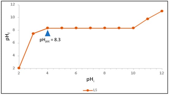 The surface area of the limestone samples, shifting from the micro- to nanoscale, was evaluated using the BET nitrogen adsorption method. The measured surface area ranged from 1.8 to 5.74 m2/g, which is in good agreement with values reported in the literature []. To further assess the adsorption characteristics of limestone as an adsorbent and its potential electrostatic interactions with dissolved TPC, the point of zero charge (pHpzc) was determined (Figure 5). The pHpzc was found to be 8.3, consistent with previous studies []. This indicates that the limestone surface is positively charged at pH values below 8.3 and negatively charged at pH values above this threshold.