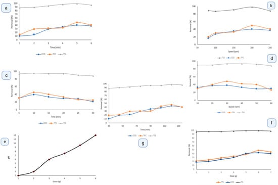Percentage removal (%) of TSS (black graph),% of COD (blue graph) and % of TPC (red graph) vs. (a) Rapid mixing time (c) slow mixing time (f) Lime dose (b) Rapid mixing speed (d) slow mixing speed (g) Settling time While (e) pH vs.Lime dose (black graph).