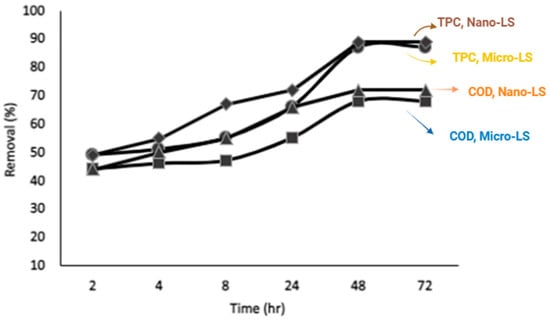 Percentage (%) removal of COD and TPC from OMW vs. contact time following chemical pretreatment at pH 8.0 using Micro. and Nano. limestone (LS) where: