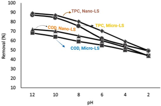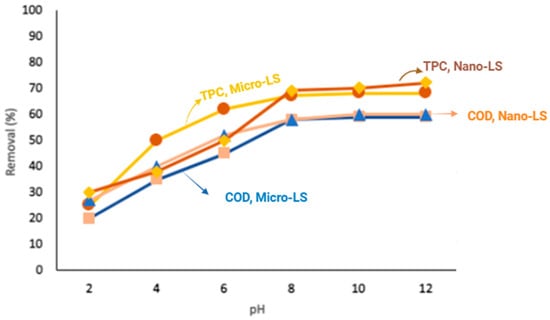 pH adjustment not only promotes the coagulation of suspended particles but also converts phenolic compounds into forms that are more adsorbable and less soluble []. Moreover, lime can adsorb phenolic compounds and organic matter through electrostatic interactions, forming complexes with calcium ions on its surface. Consequently, lime emerges as a highly effective, cost-efficient, and high-performance material for OMW pretreatment, particularly given its role in odor reduction and low cost []. Under optimized conditions, the removal efficiencies for TSS, COD, and TPC were 99%, 43%, and 48%, respectively.