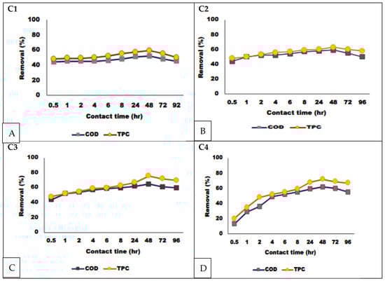 Percentage (%) removal of (TPC) and COD in OMW vs. time at different column scenarios where: (A) C1 (B) C2 (C) C3 (D) C4.
