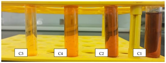 Color changing after treatment for OMW in column at different column scenarios where: Dark brown (C1) medium brown (C2) Orange (C3) yellow (C4).