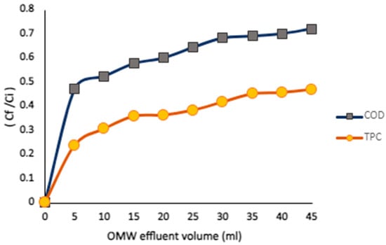 In the fourth column experiment (C4), a pump was used to circulate OMW through the column at a flow rate of 0.5 mL/min, without any pH adjustment. Figure 19 presents the breakthrough curve obtained from this setup. The breakthrough ratio (CF/CI) was used to evaluate the effectiveness of the adsorption process at different OMW volumes. Starting with an OMW volume of 5 L, the ratios gradually increased, reaching a volume of 45 L. Higher breakthrough ratios indicate a greater rise in effluent concentration relative to the influent, reflecting the extent of adsorbent saturation or “leakage” in the system. This trend is consistent with some reported observations []. The gradual increase highlights the progressive loading of the adsorbent and emphasizes the need for further optimization to maintain adsorption efficiency as the OMW volume increases.