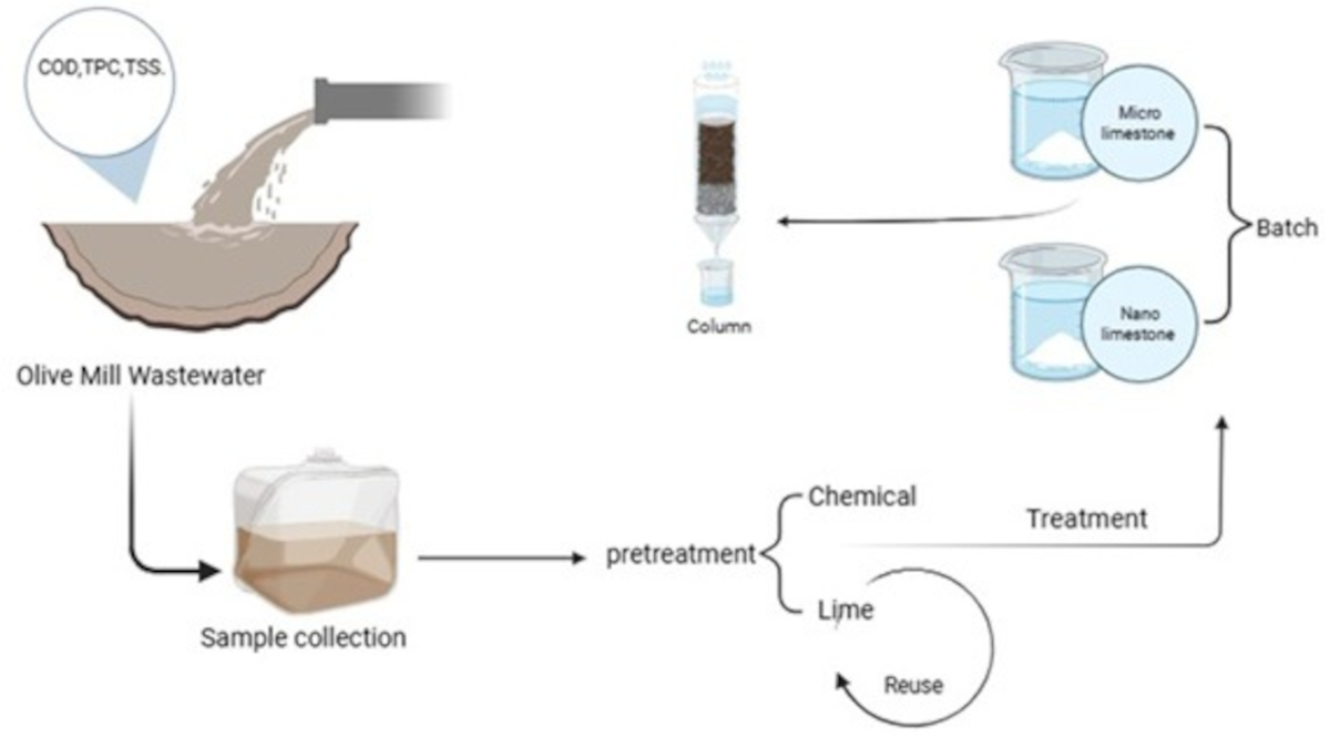 While natural adsorbents such as limestone, clays, biochar, and activated carbon have been studied for OMW remediation, these approaches often address adsorption and coagulation separately and rely on imported or synthetic materials with high operational costs. The novelty of the present work lies in the integrated use of lime and locally sourced nano-limestone composites derived from Jordanian carbonate waste to establish a dual-function treatment process that couple’s coagulation–flocculation pretreatment with subsequent adsorption. This combined strategy allows the assessment of synergistic effects between lime-induced aggregation and nanoscale adsorption, enhancing removal efficiency for both phenolic compounds and chemical oxygen demand (COD). Furthermore, by valorizing abundant native limestone resources, this study advances a cost-effective and sustainable pathway for agricultural wastewater management within a circular economy framework—an aspect that remains largely unexplored in previous Mediterranean studies.