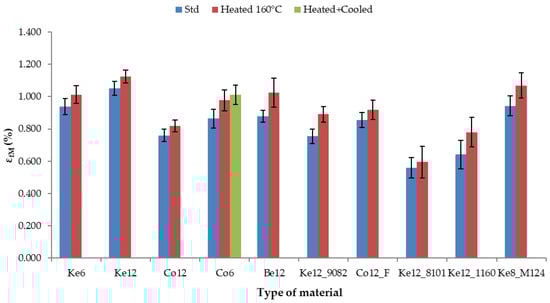 Alongside σf, the measured εf characterises deformability up to failure. Flexural strain at break (εf,b) and the maximal flexural strain (εfM) were identical, indicating that PMMA/ATH composites break before yielding. Mean values span 0.60–1.10%, with most series clustering around 0.80–0.95%, which is well below the conventional 3.5% for ISO 178 at L = 16 h, indicating small-strain/elastic behaviour (Figure 7). Overall, 12-mm sheets exhibit lower εf (0.75–0.85%) compared to 6–8-mm sheets (0.85–0.95%); the decorative-filled series (e.g., Ke_8101, 1160) lies at the lower end, consistent with a more brittle flexural response. Conversely, series such as 4_Ke12 and Ke8_M124 exhibit higher εf, indicating greater deformability. Where σf is similar across series, differences in εf help distinguish failure mode: high σf with low εf suggests abrupt (brittle) failure, whereas higher εf at comparable σf implies a more gradual, ductile-like deflection prior to failure.