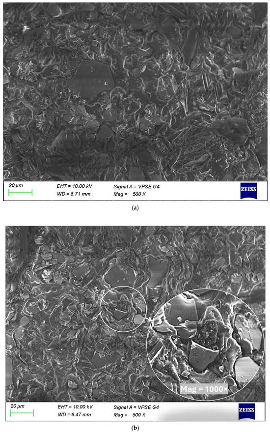 In contrast, the thermally treated composite (Figure 13b) shows clear signs of microstructural separation between the particles and the resin after failure. Several ATH particles exhibit partial detachment from the surrounding matrix, resulting in visible gaps at the interface. This most likely occurred due to a mismatch in thermal expansion between PMMA and ATH during heating and cooling. The fracture surface is markedly rougher, with the presence of microcracks, indicating an increased tendency toward brittle failure. The appearance of voids and cracks should indicate a reduced ability of the composite to redistribute stress, which would worsen its bending characteristics. However, this is not confirmed by the results for determining the flexural strength, and the likely explanation is that, as a result of heat treatment, the fracture occurs at the boundary between the matrix and filler without reducing the adhesion between them.