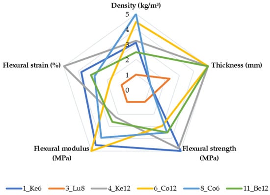 The radar chart in Figure 14 compares the PMMA/ATH composites based on several physical and mechanical indicators. Density, thickness, flexural strength, flexural modulus, and flexural strain were mapped to a standard 1–5 scale using fixed reference limits (density: 1650–1800 kg/m3; thickness: 6–12 mm; flexural strength: 50–100 MPa; flexural modulus: 7000–10,000 MPa; flexural strain: 0.80–1.60%). The minimum of each range corresponds to 1 and the maximum to 5; the same scaling is applied to all materials and figures for comparability. A separate coloured polygon represents each material; the further out the line is on a given axis, the higher the relative value of that parameter. The shape of the polygon highlights the strengths and compromises of each material, while overlaps indicate similarities between them.
