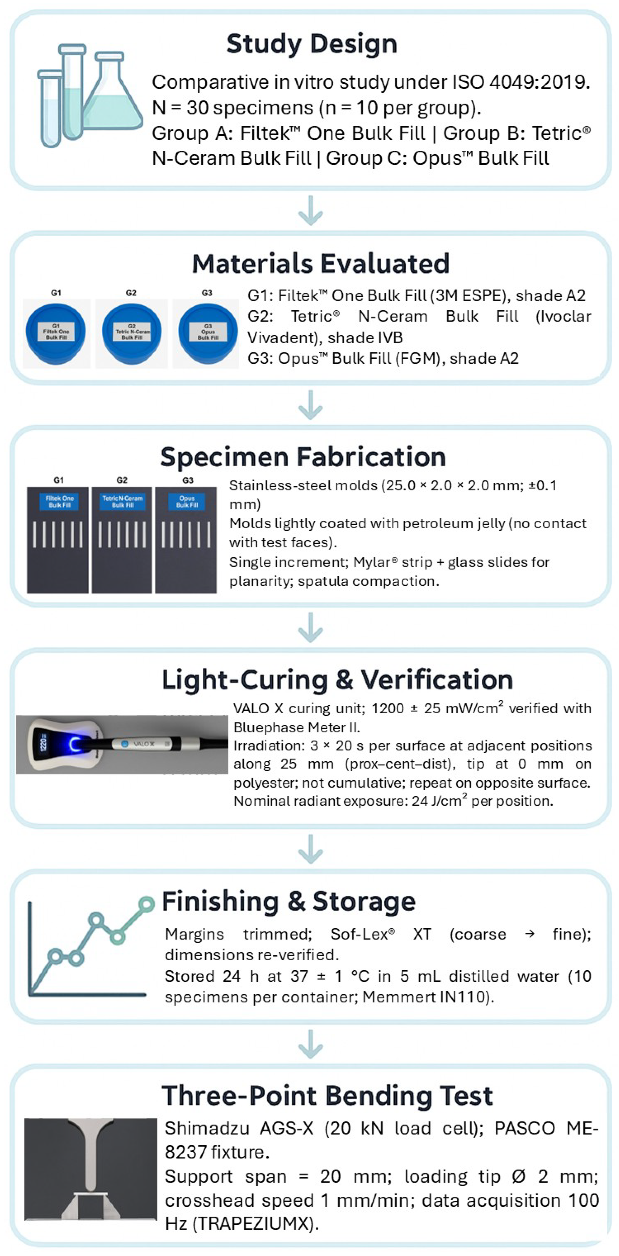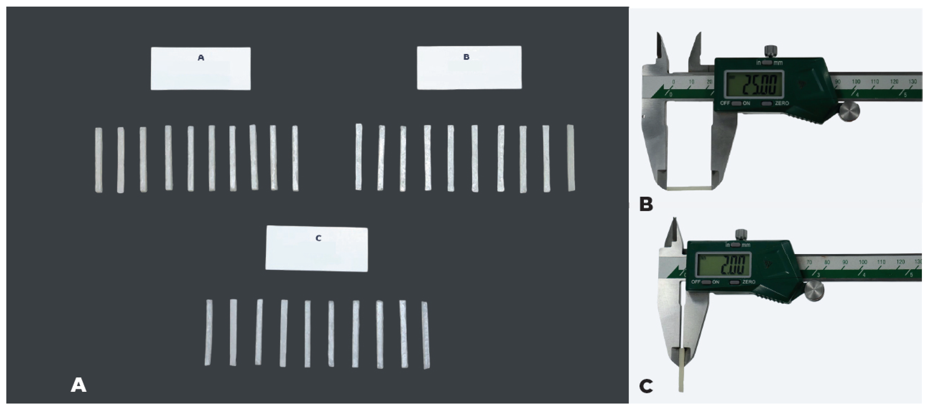 - Group C (Opus™ Bulk Fill APS)—FGM, Joinville, Brazil; Shade: A2; Lot: 051224; Exp.: 12/2026. The following commercially available BFCRs were tested:
