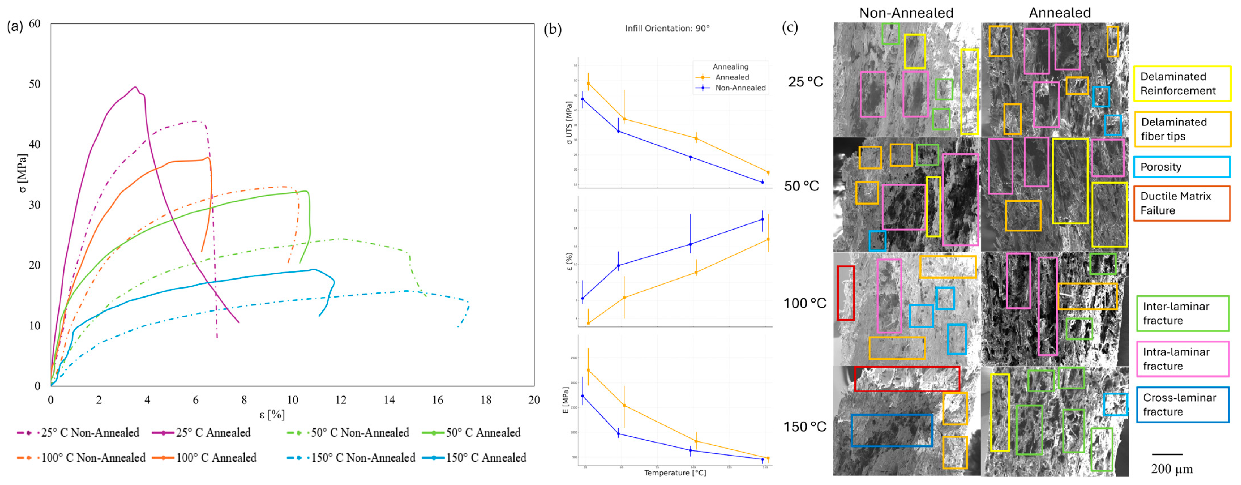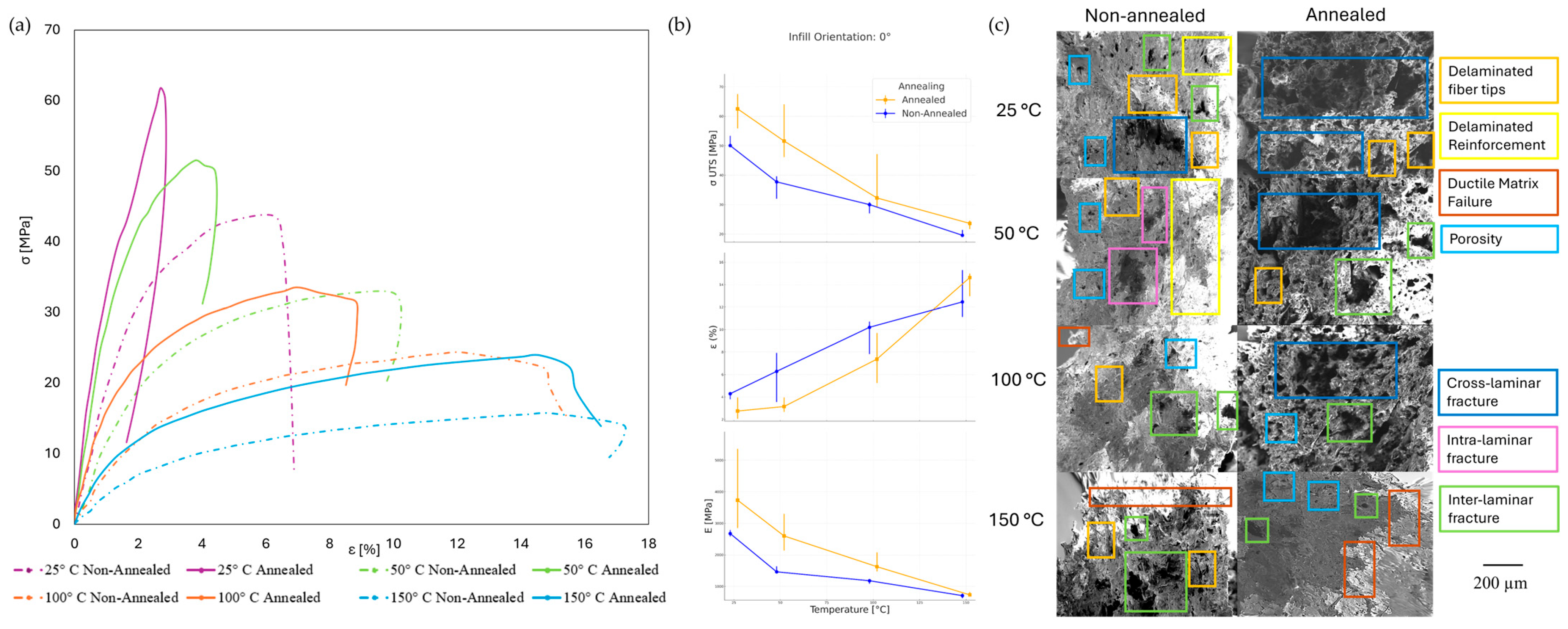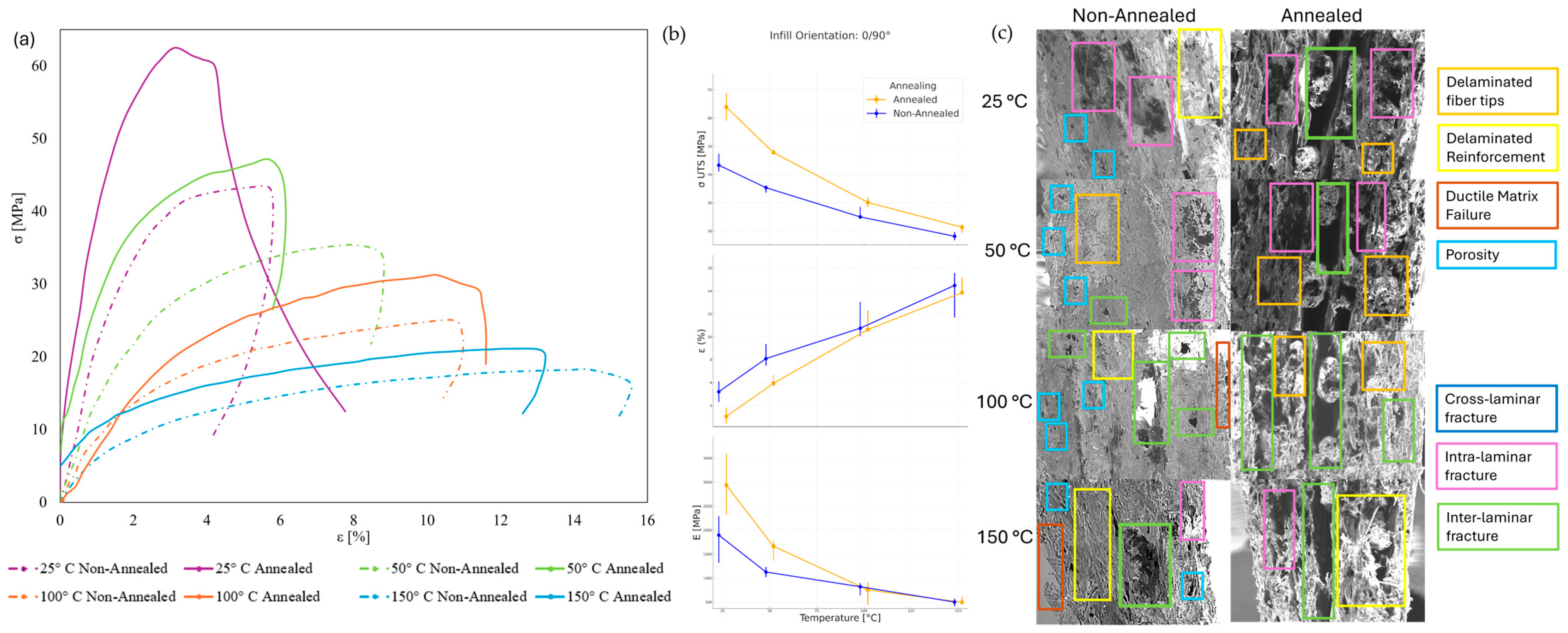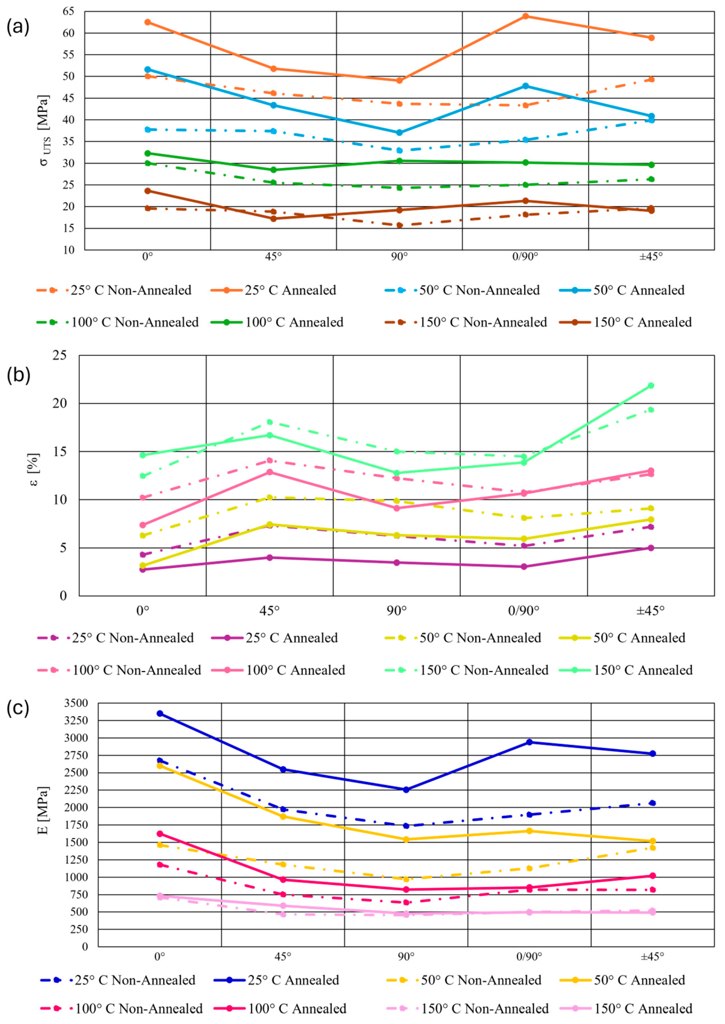 - Annealing significantly improved strength and elastic modulus by enhancing matrix properties. The benefits were most pronounced and temperature-resistant in the 0° and 0/90° patterns, where the load is carried by the fibers.