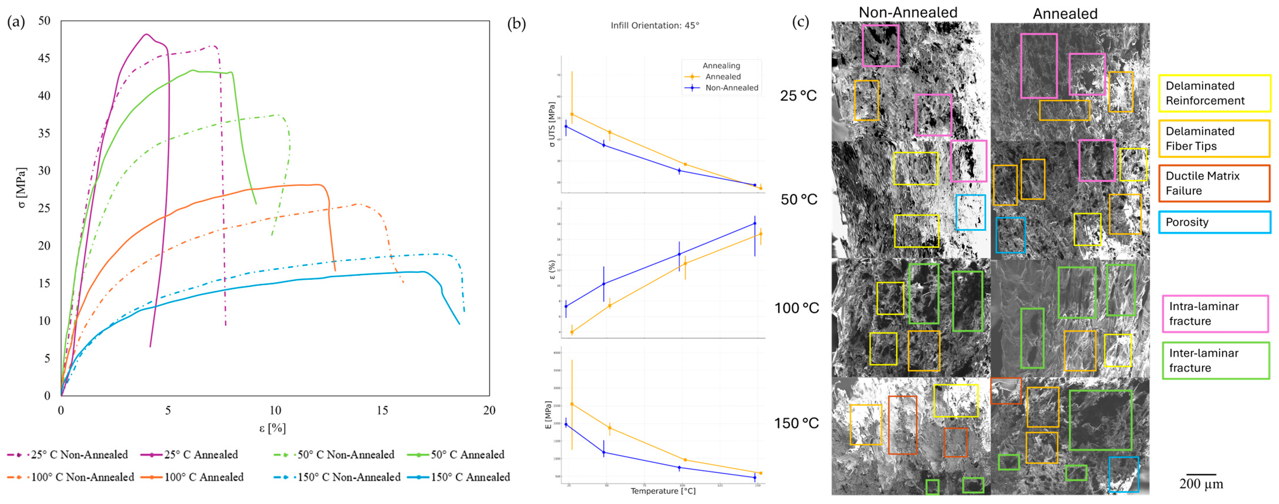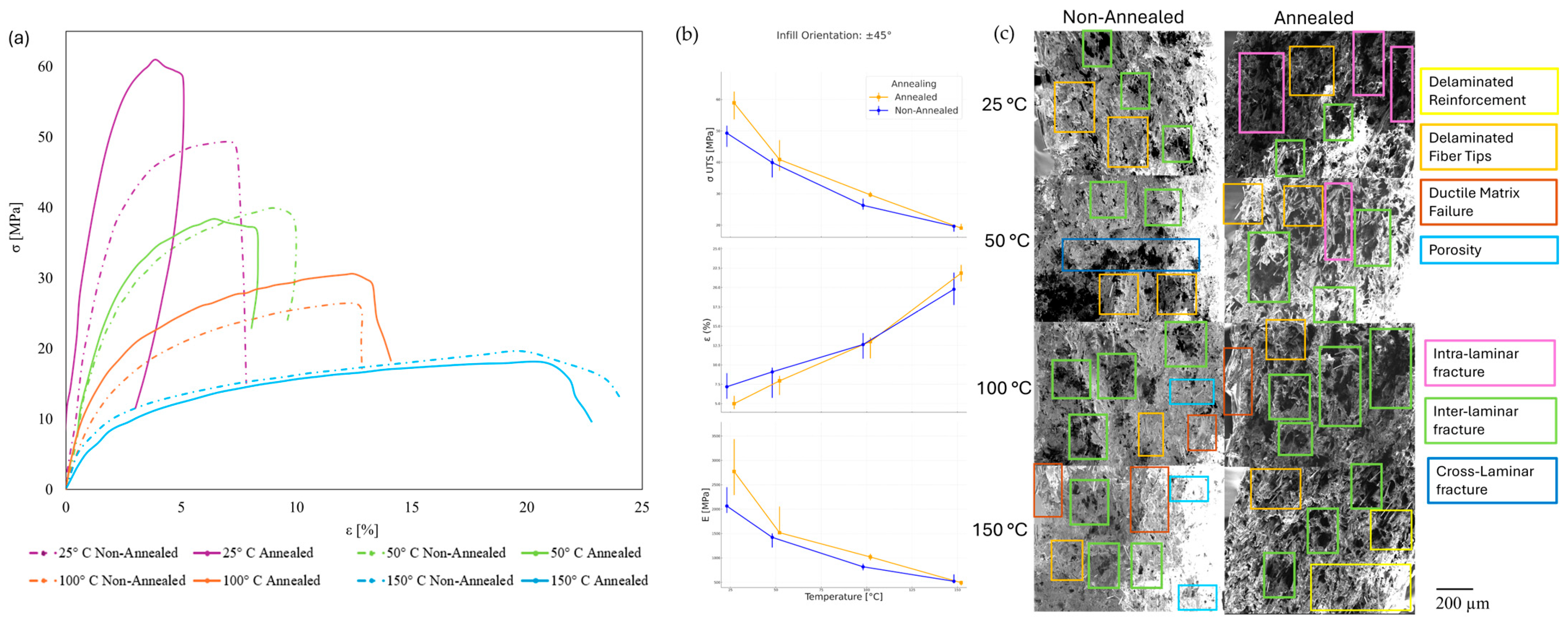 - For the 45° and ±45° infills, failure is governed by matrix-dominated shear and bead slipping. Consequently, annealing had a limited effect on these orientations, especially above Tg where the matrix softens [42].