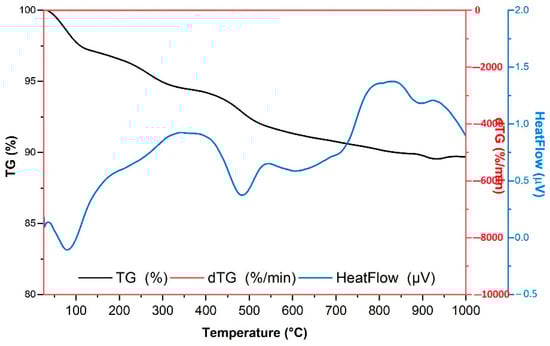 Under a nitrogen atmosphere, the diatomite thermogram (Figure 2) shows a gradual mass loss from room temperature to 1000 °C. The first step between ~50–150 °C caused about 3–4% weight loss, mainly due to the evaporation of physically adsorbed water and the release of weakly bound surface hydroxyl groups from the silica structure. From ~150 to 600 °C, a slower and continuous weight loss of ~6% is observed, mainly due to the gradual removal of silanol groups (dehydroxylation of opal-A) and the pyrolysis of minor organics under nitrogen. Above ~800 °C, the TG curve levels off, showing the high thermal stability of the silica framework. The dTG curve confirms these events with a sharp peak near 100 °C for moisture loss and weaker, broad signals between 200–600 °C linked to bound-water release and trace organics, while no major peaks appear at higher temperatures. Overall, the total mass loss (~10%) is dominated by water release, with little contribution from organics, and the high-temperature changes mainly reflect structural densification and rearrangement of the amorphous silica network, with possible polymorphic transitions. The DTA curve also showed an endothermic event below 150 °C associated with water evaporation, followed by broad thermal effects mainly after 400 °C that suggest structural rearrangements of the amorphous silica network and possible transformation into more crystalline forms such as cristobalite or tridymite.
